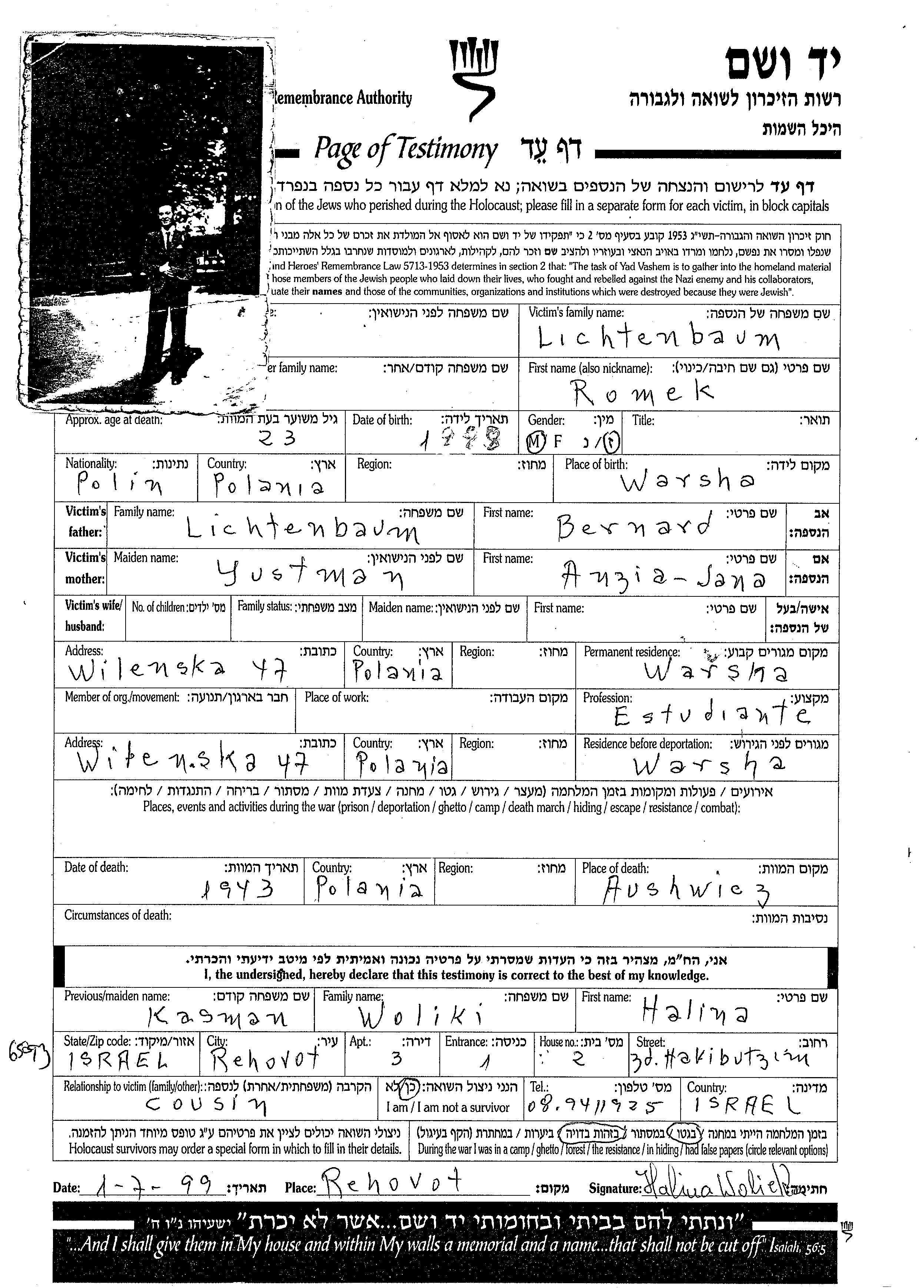 Romek Lichtenbaum wurde im Jahr 1918 in Warszawa, Polen geboren. Er war Student. Vor dem Zweiten Weltkrieg lebte er in Warszawa, Polen.