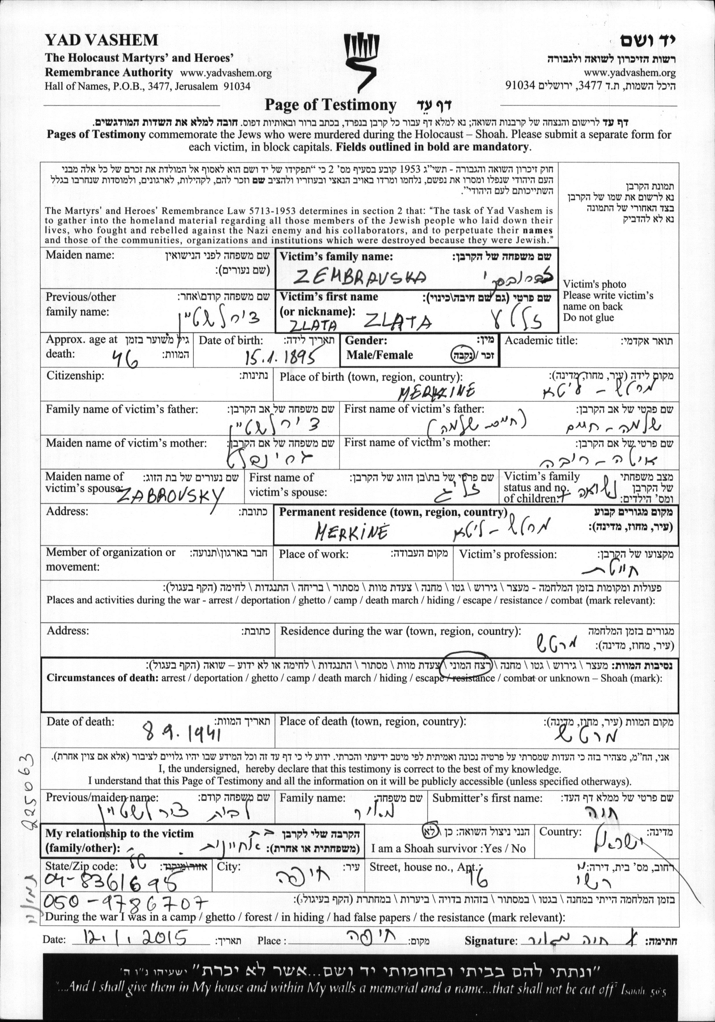 Zlata Zembrauska Zabrovski, geb. Tzirelshtein wurde im Jahr 1895 in Merkine, Litauen geboren. Sie war Schneider. Vor dem Zweiten Weltkrieg lebte sie in Merkine, Litauen.