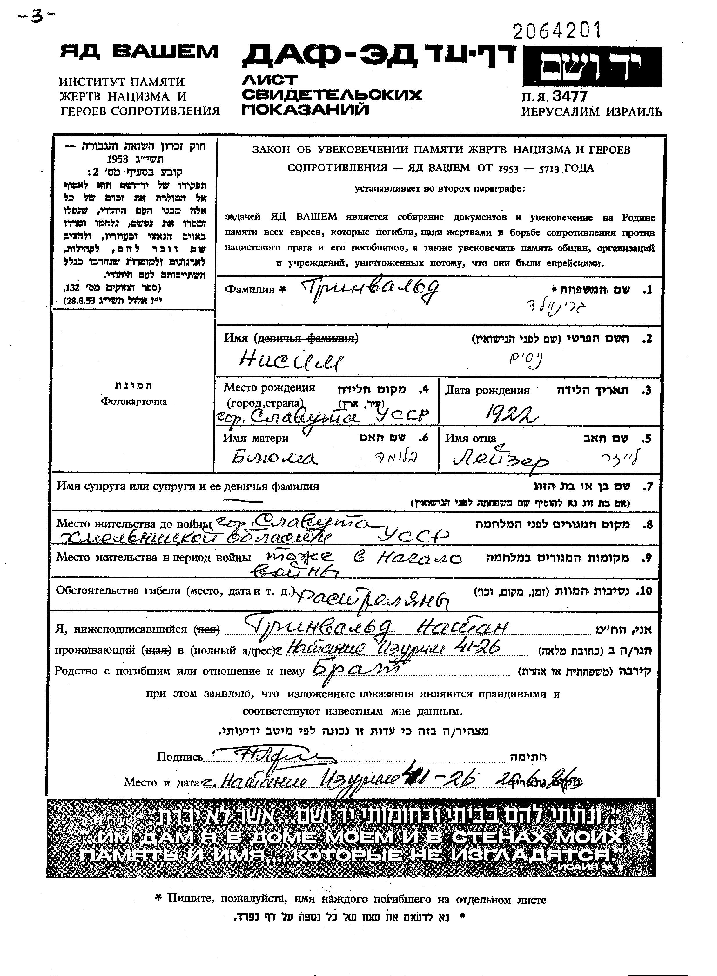 Grinvald Nisim 1922 Slavuta, Ukraine (UdSSR) Gedenkblatt