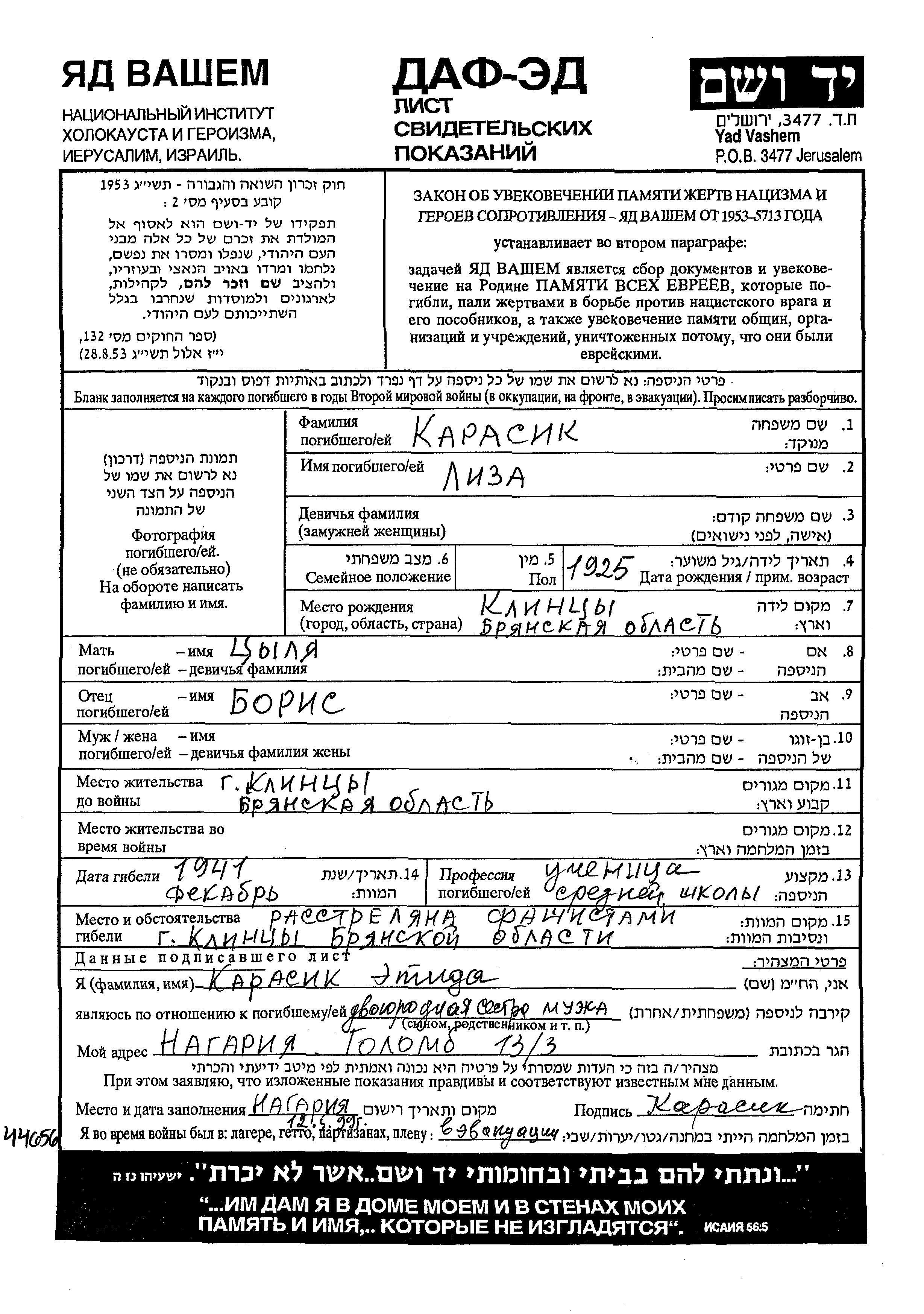 Karasik | Yelizaveta | 1925 | Klintsy, Russland (UdSSR) | Gedenkblatt |