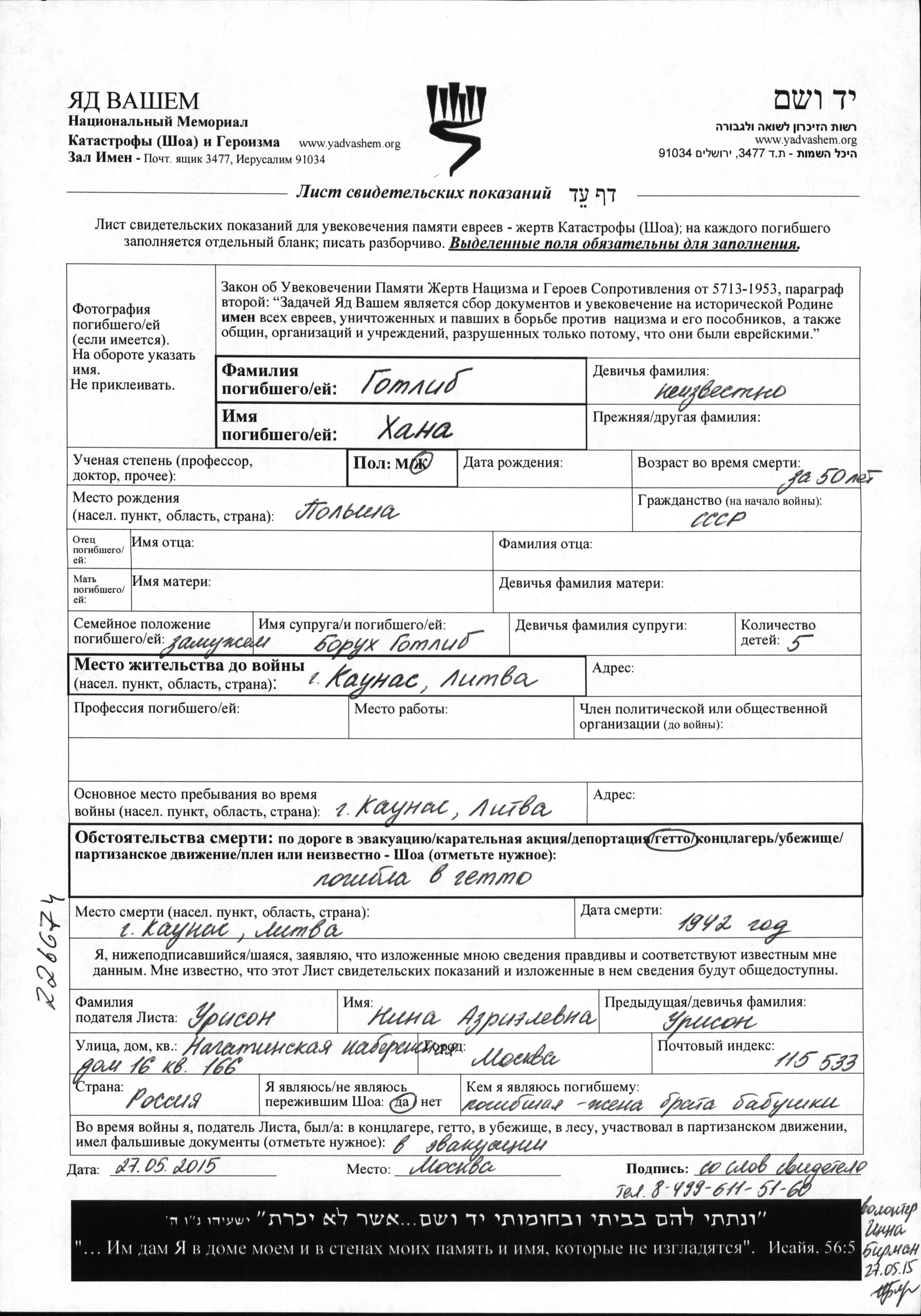 Khana wurde in der Schoah ermordet. Todesort: Kaunas, Litauen im Jahr 1942.
