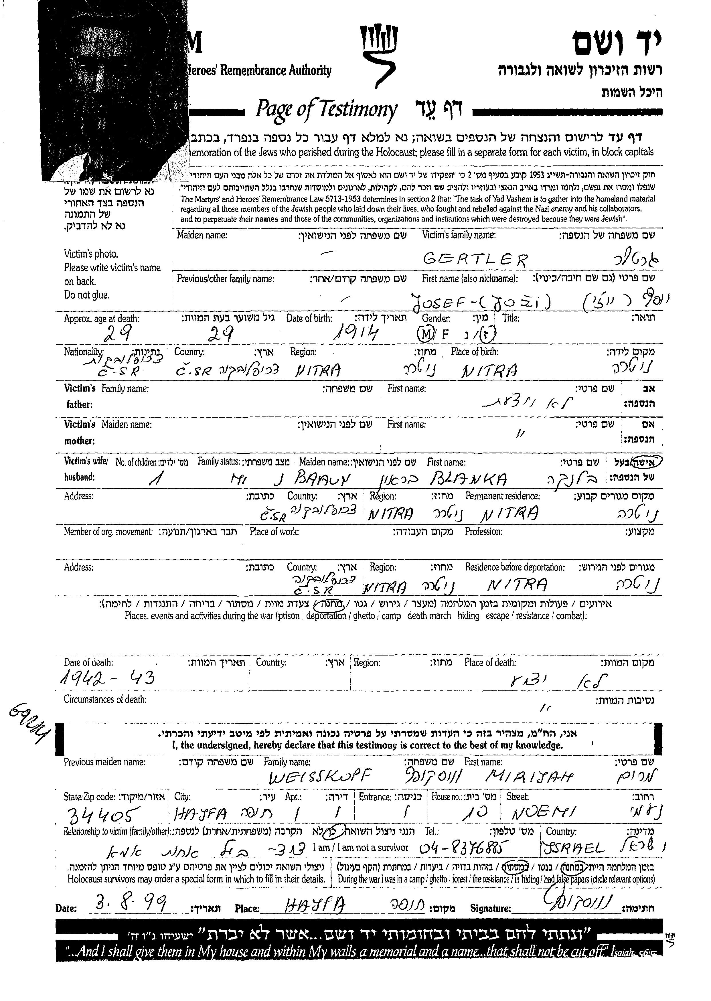 Josef Gertler wurde im Jahr 1914 in Nitra, Tschechoslowakei geboren. Vor dem Zweiten Weltkrieg lebte er in Nitra, Tschechoslowakei.