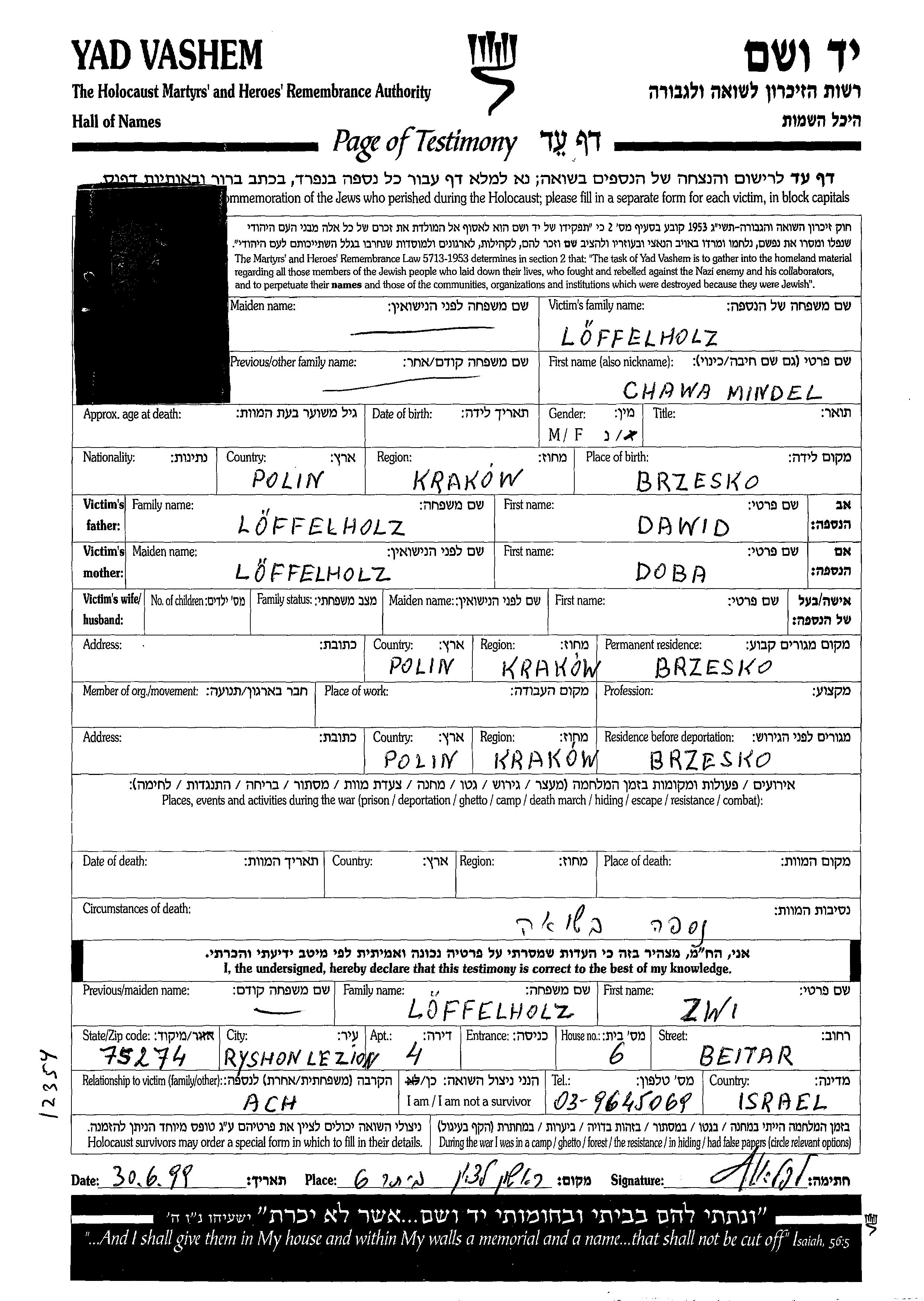 Chawa Mindl Loffelholz wurde in Brzesko, Polen geboren. Vor dem Zweiten Weltkrieg lebte sie in Brzesko, Polen.