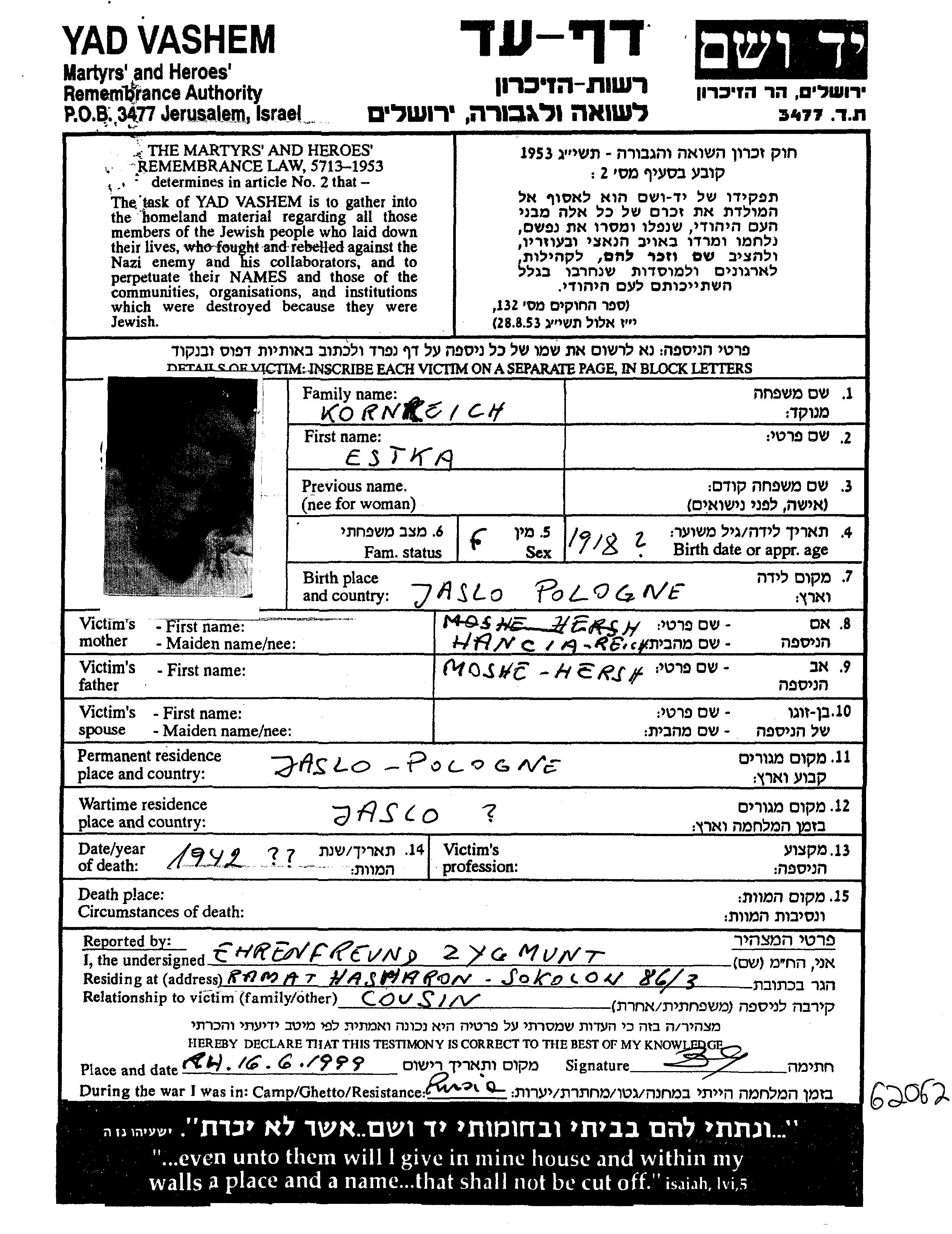 Estka Kornreich wurde im Jahr 1918 in Jaslo, Polen geboren. Vor dem Zweiten Weltkrieg lebte sie in Jaslo, Polen.