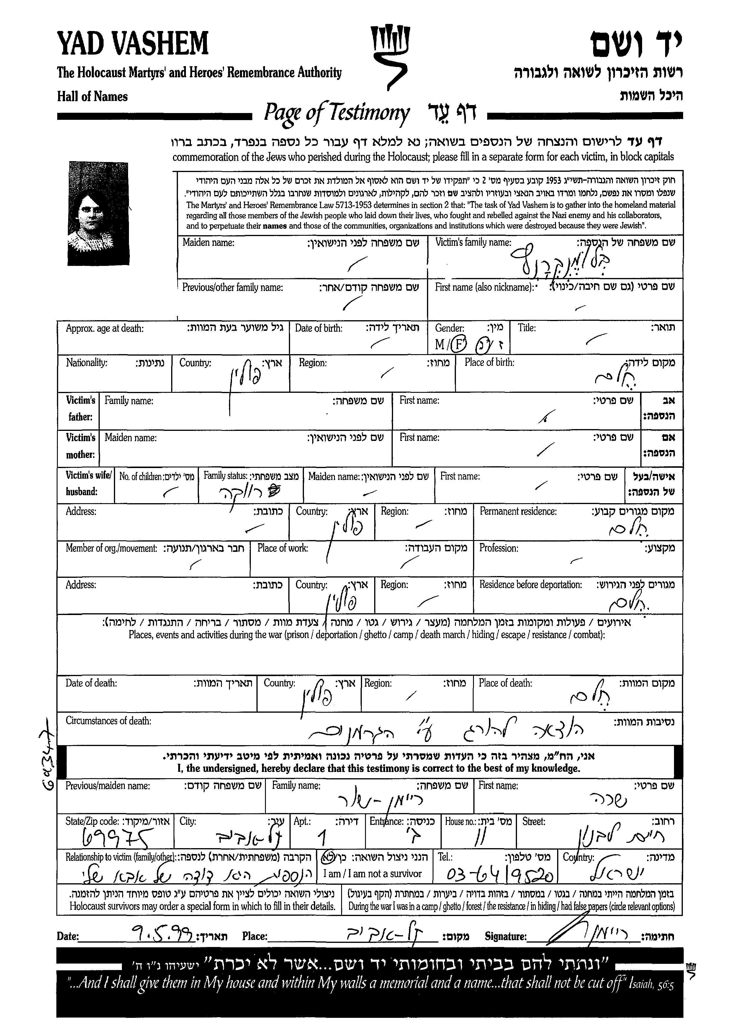 Blumenkrantz Vorname unbekannt Chelm, Polen Gedenkblatt