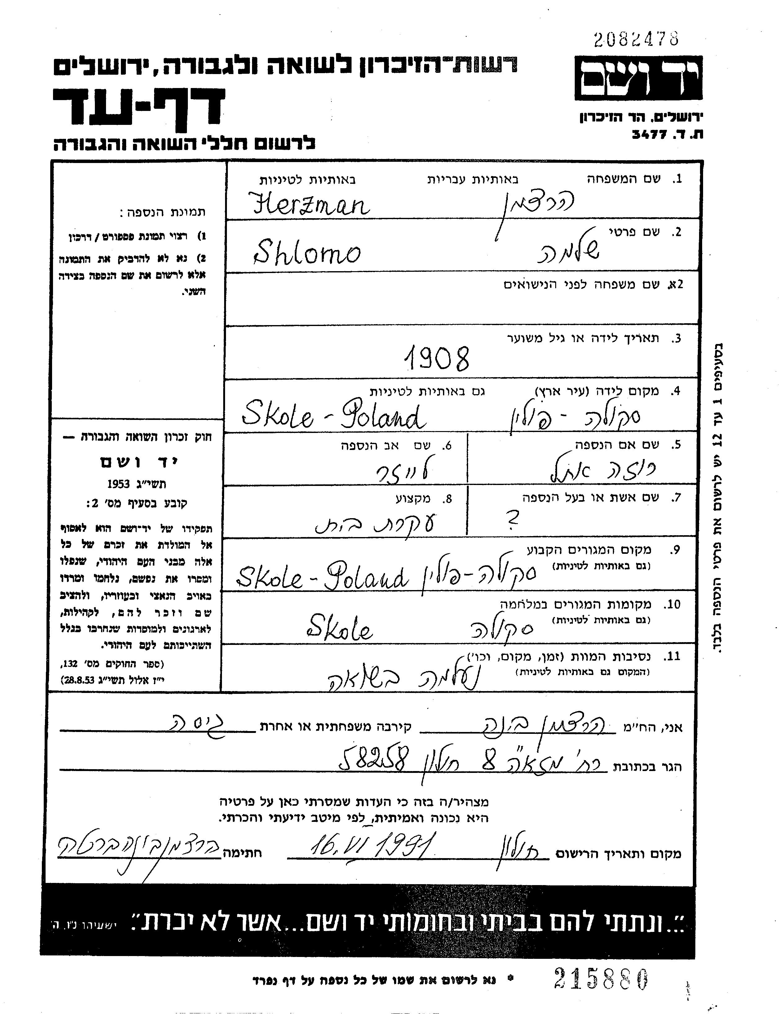 Shlomo Herzman wurde im Jahr 1908 in Skole, Polen geboren. Er war der Sohn von Leizer und Etl Roza, geb. Szwarc. Er war Verheiratet. Vor dem Zweiten Weltkrieg lebte er in Skole, Polen. Während des Krieges war er in Skole, Polen.