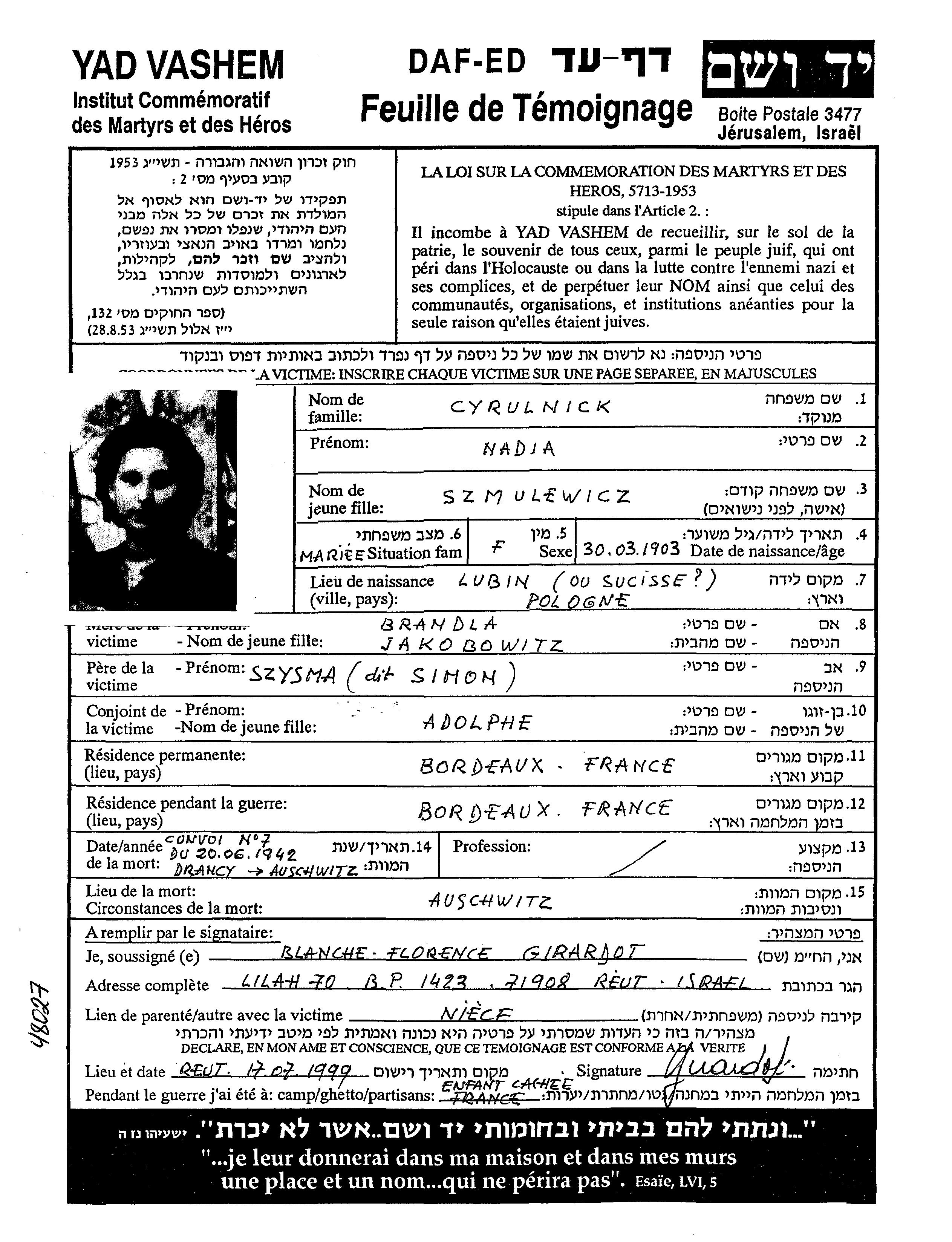Nadia Cyrulnick, geb. Szmulewicz wurde im Jahr 1903 in Lubien, Polen geboren. Vor dem Zweiten Weltkrieg lebte sie in Bordeaux, Frankreich.
