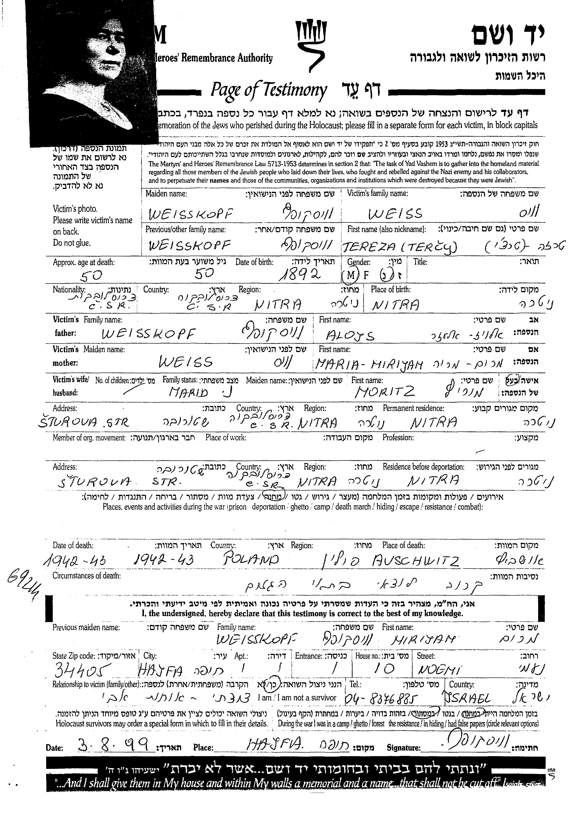 Tercy Tereza Weiss, geb. Weisskopf wurde im Jahr 1892 in Nitra, Tschechoslowakei geboren. Vor dem Zweiten Weltkrieg lebte sie in Nitra, Tschechoslowakei.