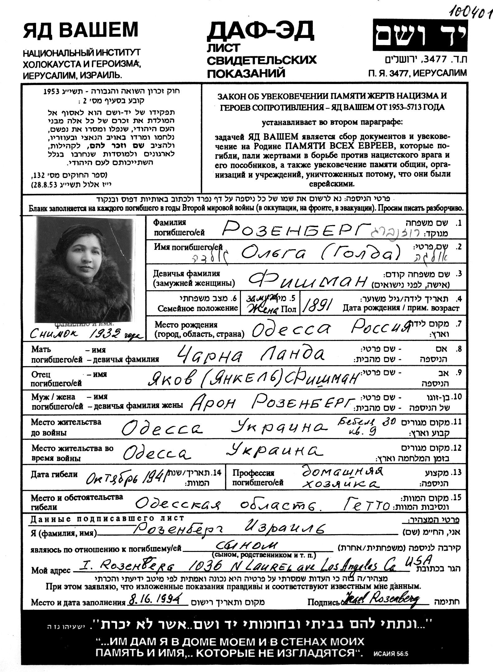 Golda Olga Rozenberg, geb. Fishman wurde im Jahr 1891 in Odessa, Ukraine (UdSSR) geboren. Sie war Hausfrau. Vor dem Zweiten Weltkrieg lebte sie in Odessa, Ukraine (UdSSR).