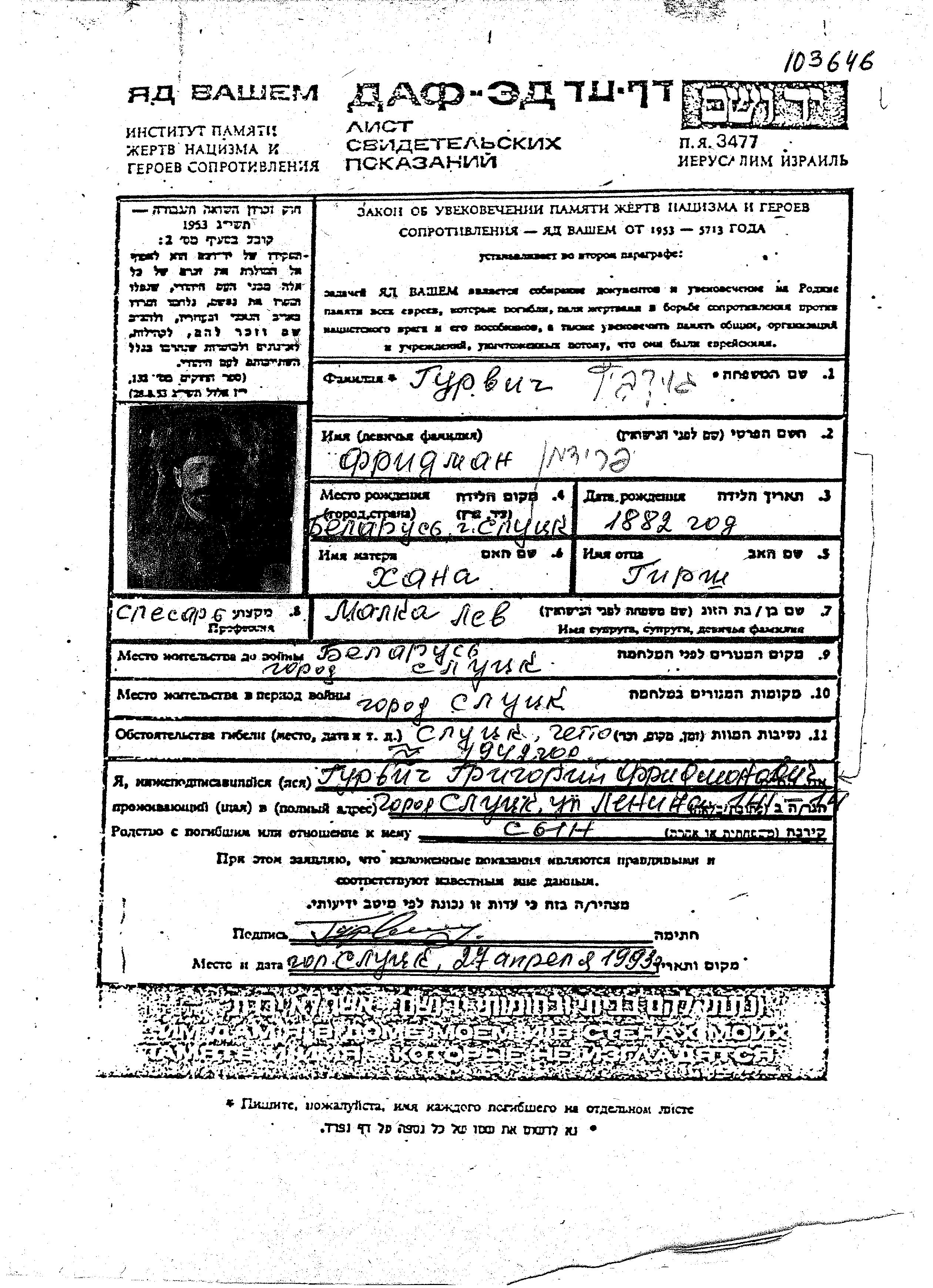 Fridman Gurvich wurde im Jahr 1882 in Slutsk, Weißrussland (UdSSR) geboren. Er war Schlosser. Vor dem Zweiten Weltkrieg lebte er in Slutsk, Weißrussland (UdSSR).