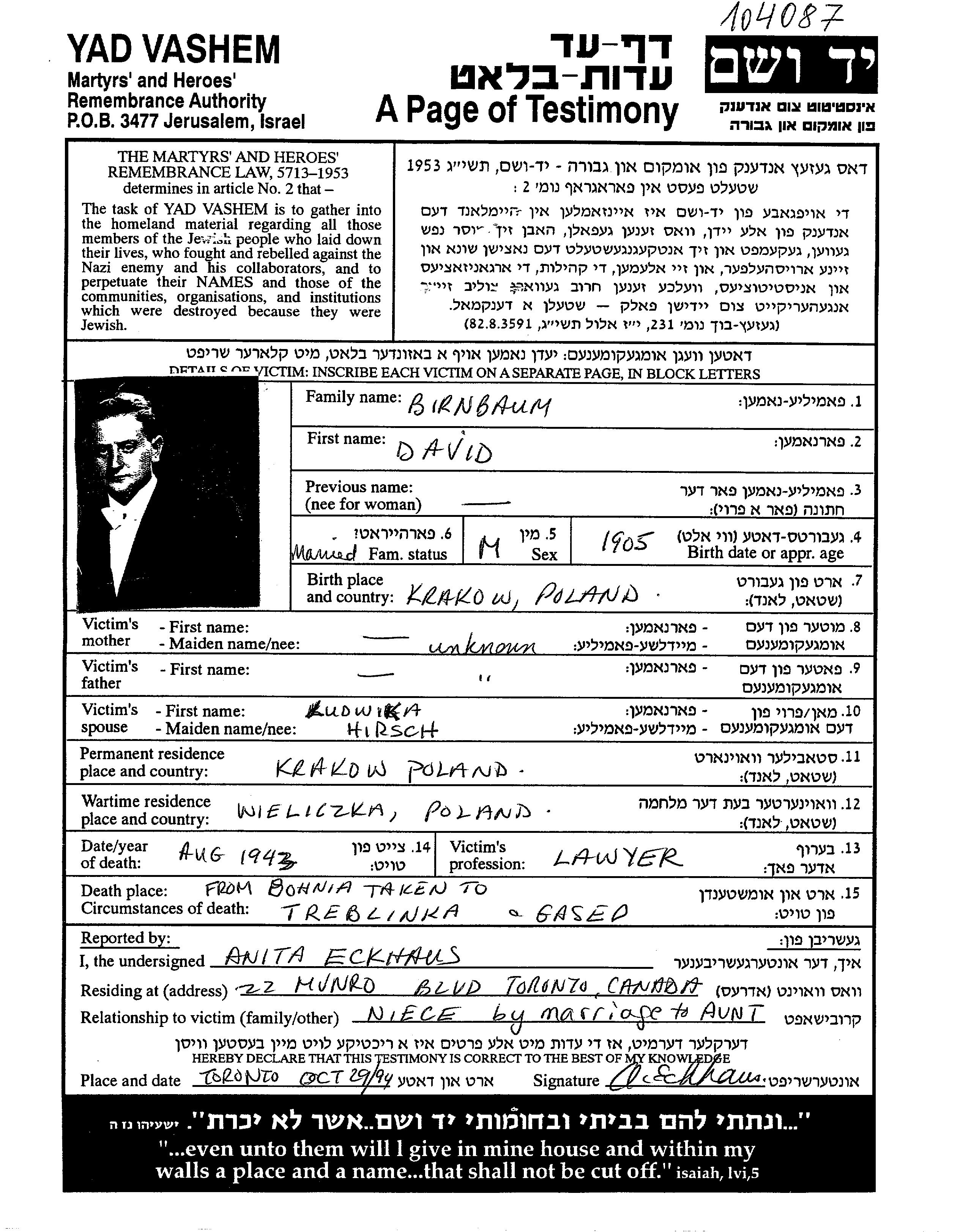 Birnbaum David 1905 Krakow, Polen Gedenkblatt