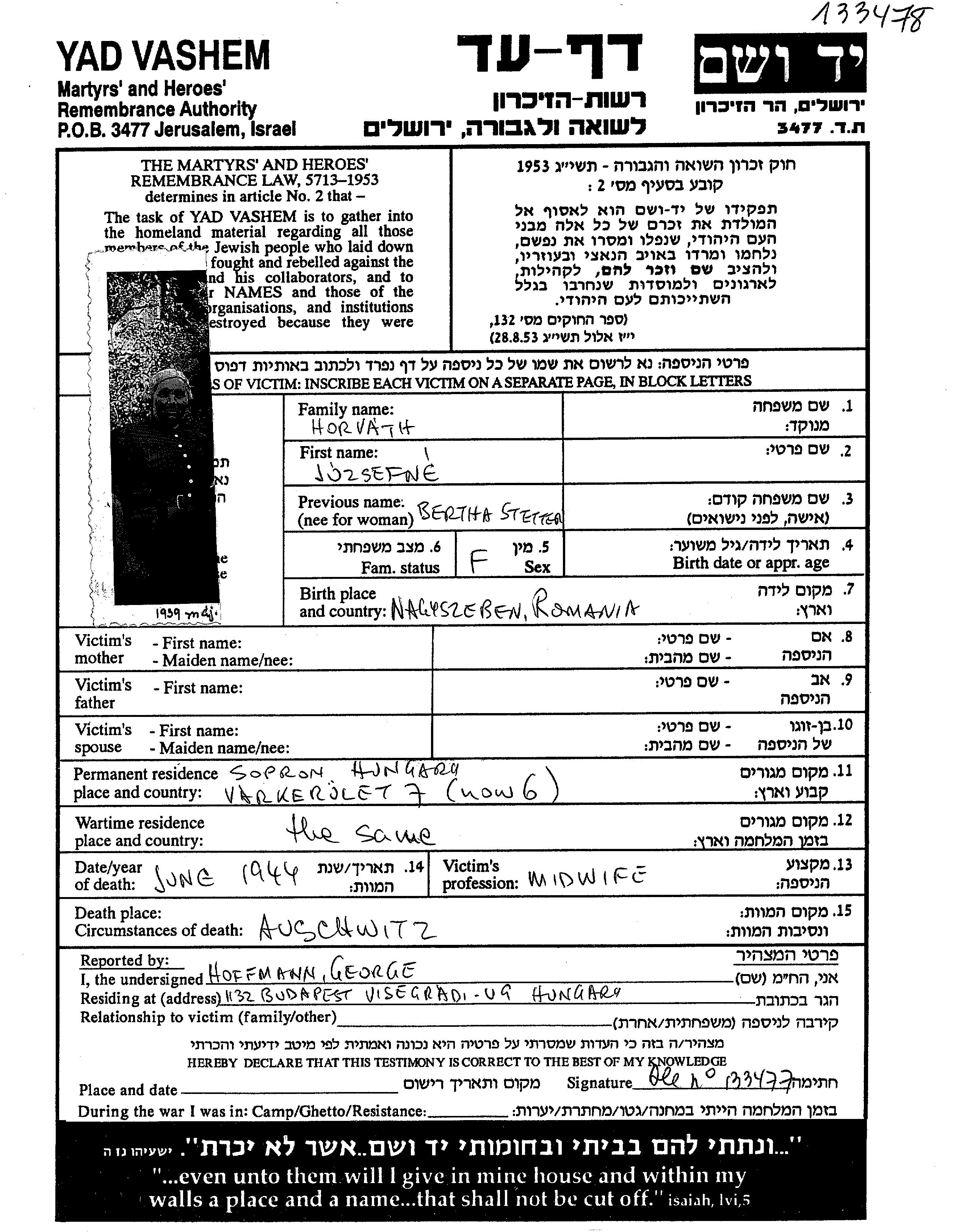 Bertha Horvath, geb. Stetter wurde in Sibiu, Rumänien geboren. Vor dem Zweiten Weltkrieg lebte sie in Sopron, Ungarn.