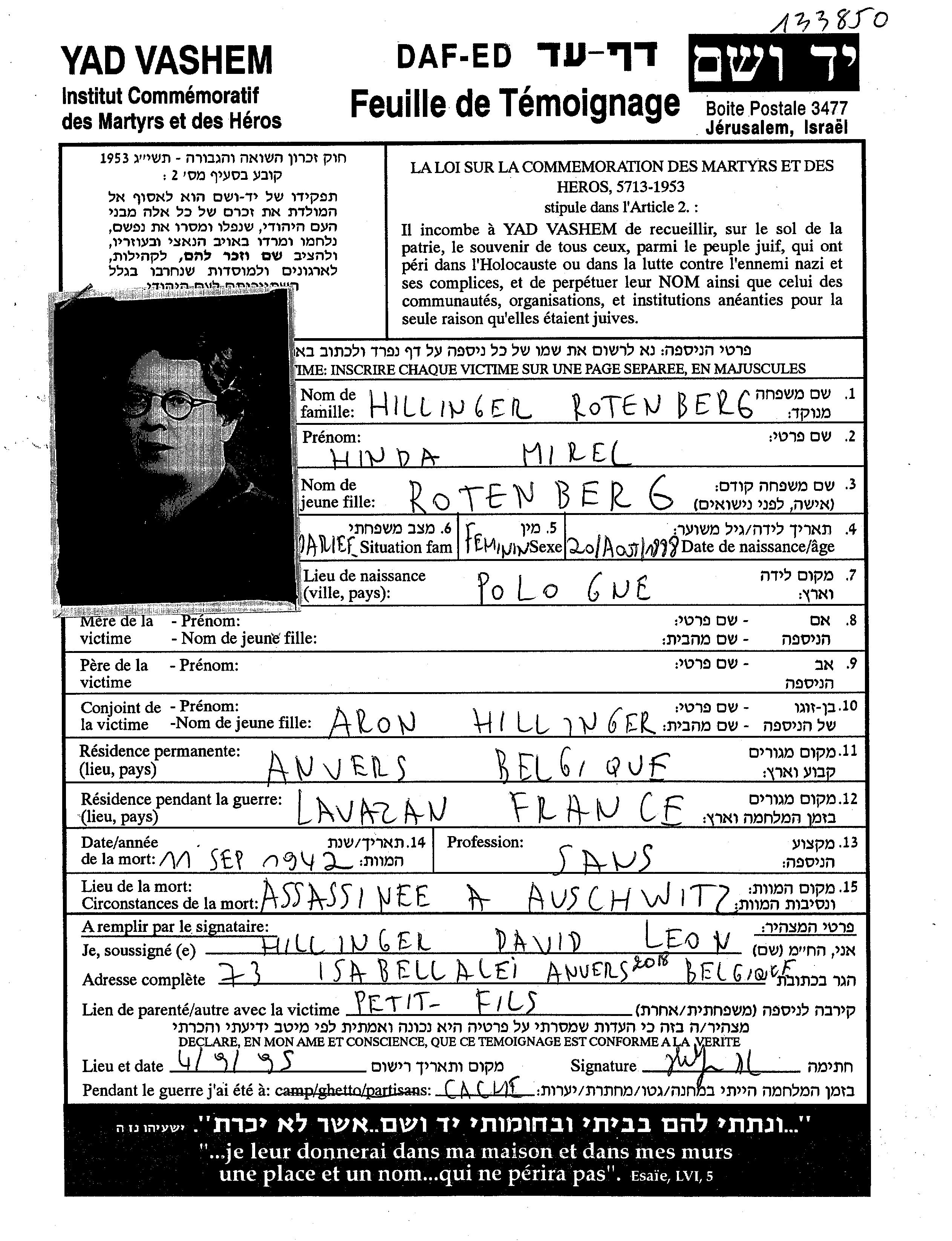 Mirel Hinda Hillinger, geb. Rotenberg wurde im Jahr 1888 in Polen geboren. Vor dem Zweiten Weltkrieg lebte sie in Antwerpen, Belgien.