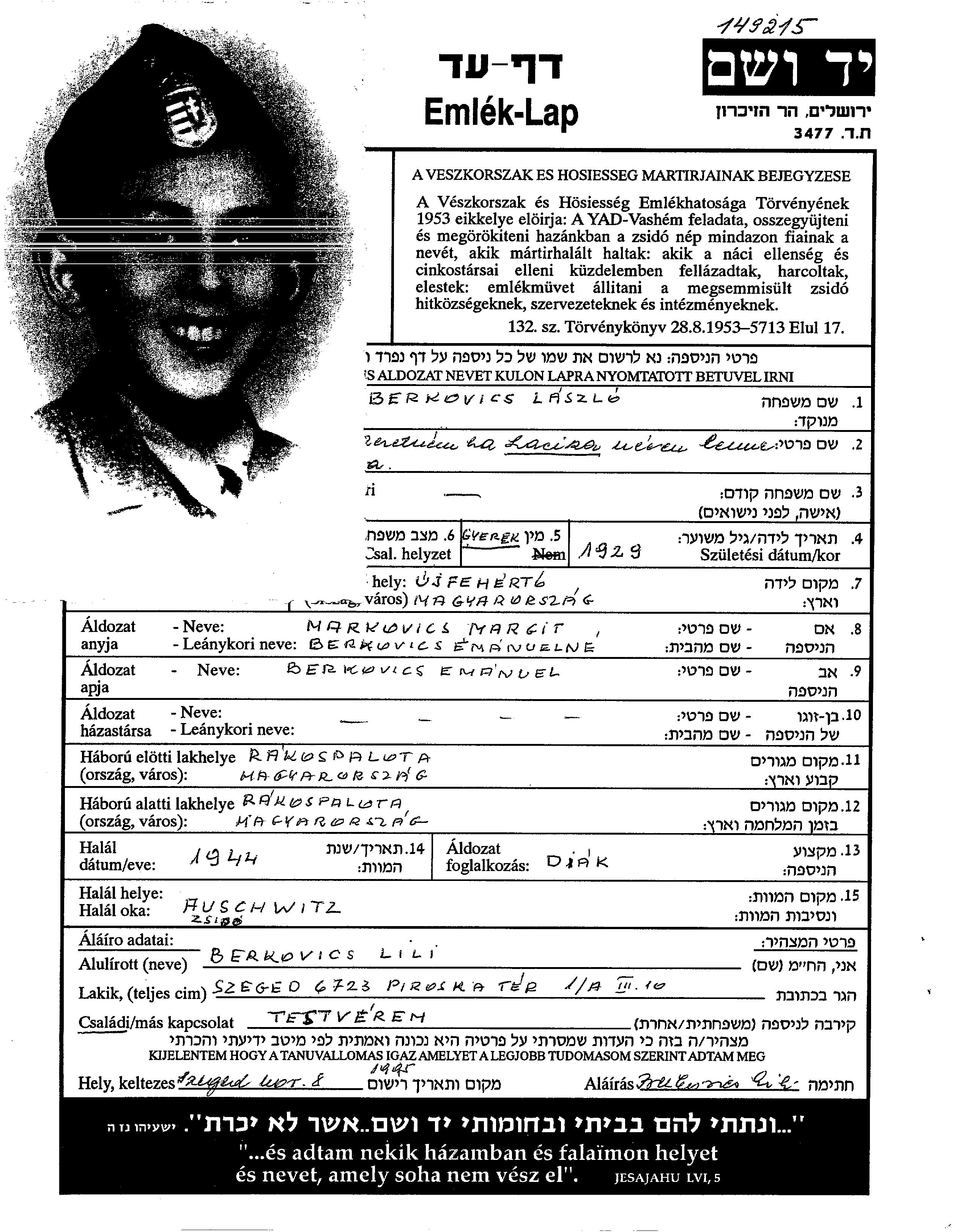 Berkovics | Laszlo | 1929 | Rakospalota, Ungarn | Gedenkblatt |