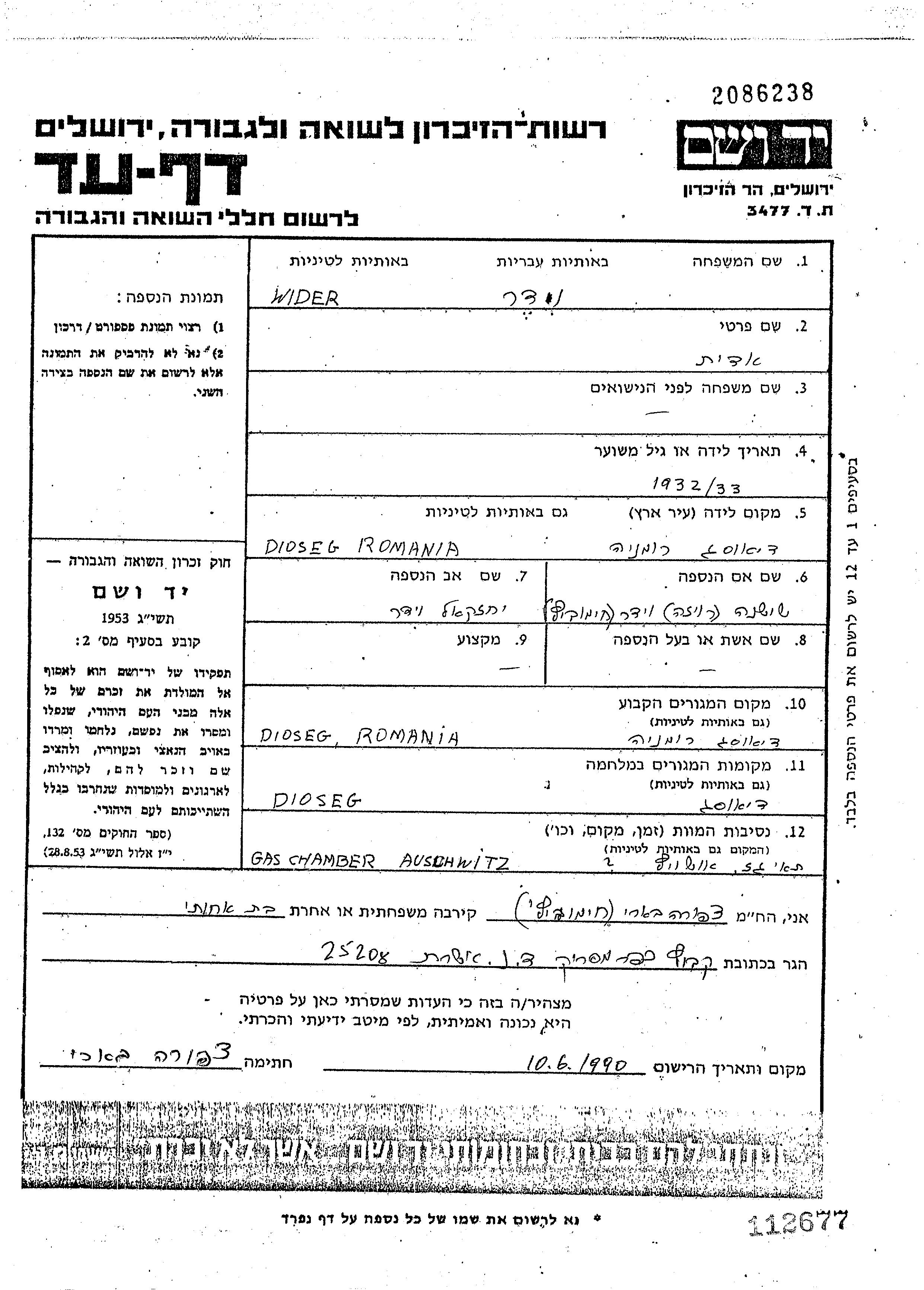 Edit Wider wurde im Jahr 1932 in Dioszeg, Rumänien geboren. Sie war die Tochter von Yekhezkel und Roiza Shoshana, geb. Khimovich. Sie war Kind. Vor dem Zweiten Weltkrieg lebte sie in Dioszeg, Rumänien. Während des Krieges war sie in Dioszeg, Rumänien.