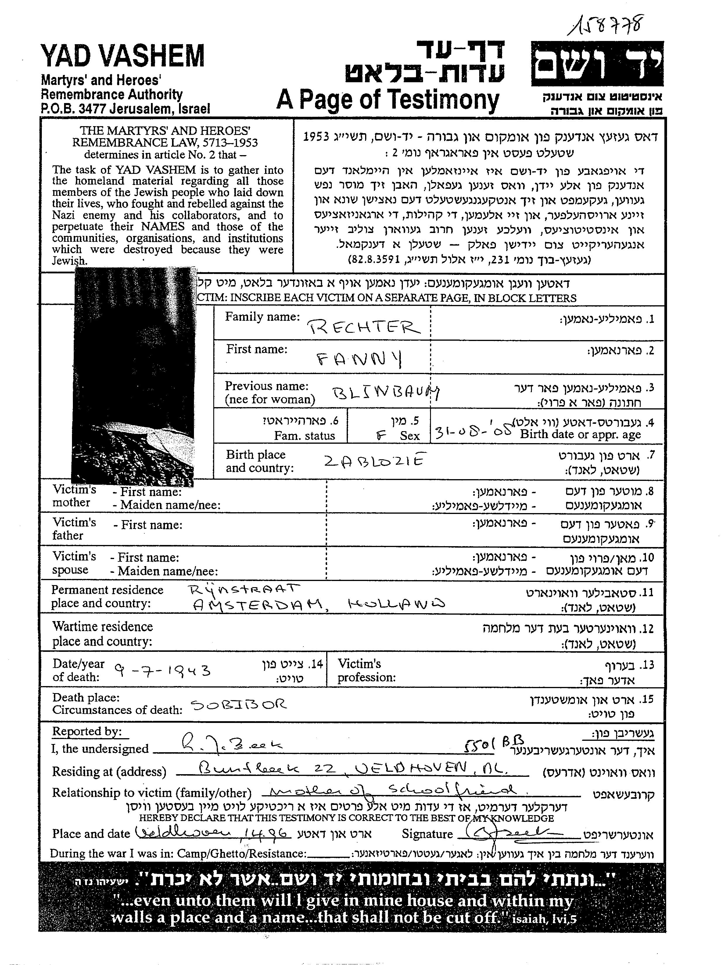 Fanny Rechter, geb. Blinbaum wurde im Jahr 1908 in Zablocie, Polen geboren. Vor dem Zweiten Weltkrieg lebte sie in Amsterdam, Niederlande.