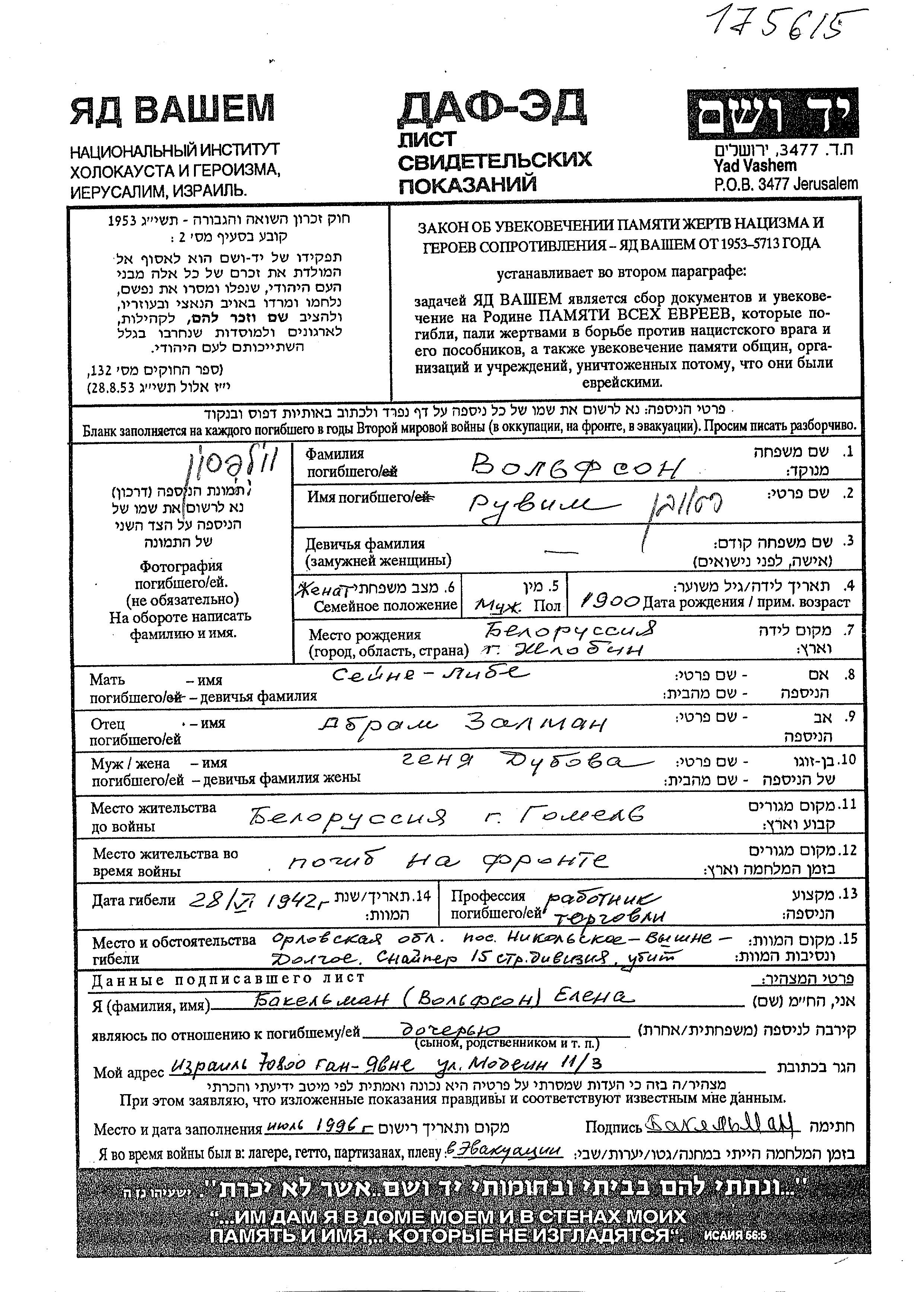 Ruvim Volfson wurde im Jahr 1900 in Zhlobin, Weißrussland (UdSSR) geboren. Er war Verkäufer/-in. Vor dem Zweiten Weltkrieg lebte er in Gomel, Weißrussland (UdSSR).