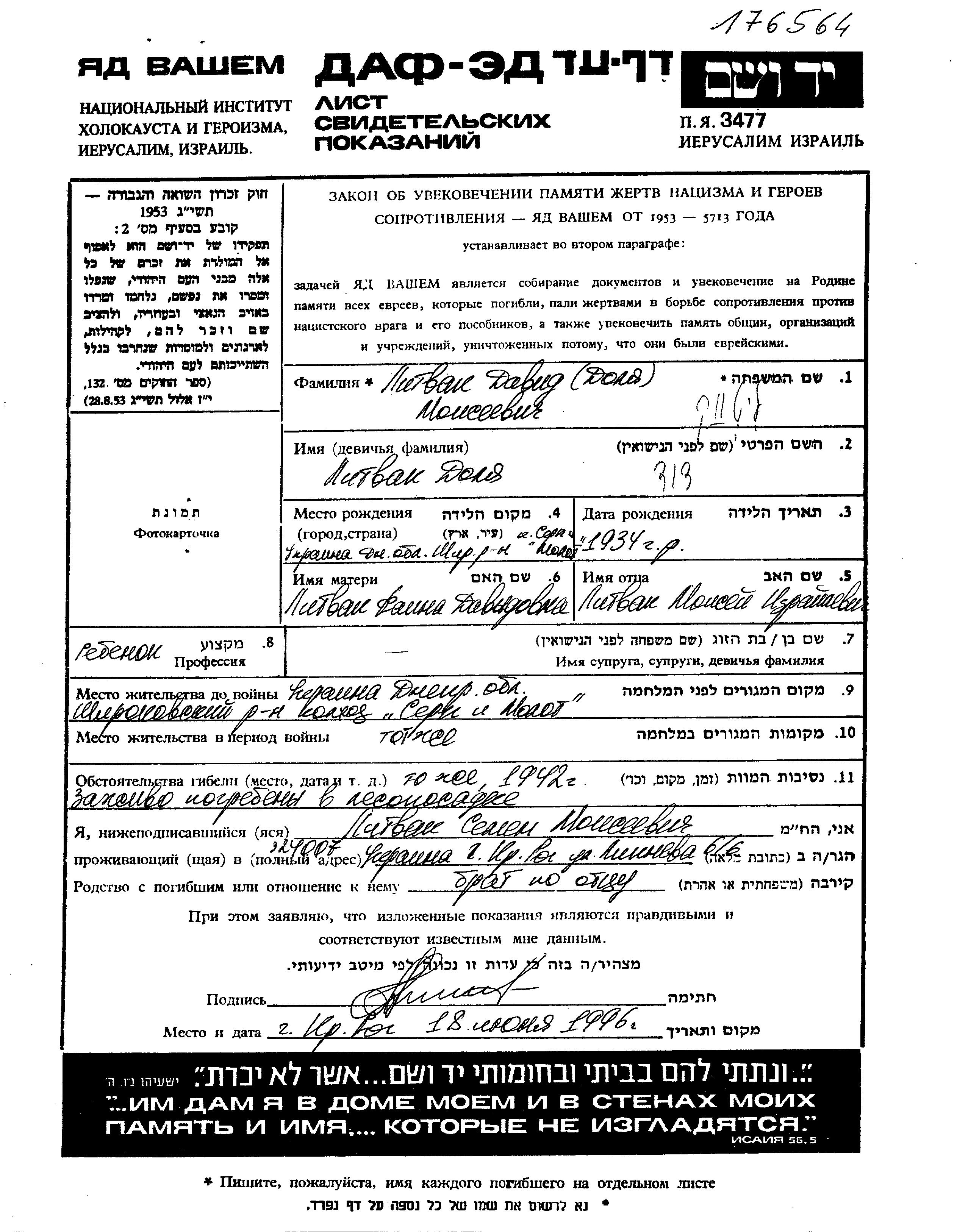 Litvak Dolya David 1934 Dnepropetrovsk, Ukraine (UdSSR) Gedenkblatt