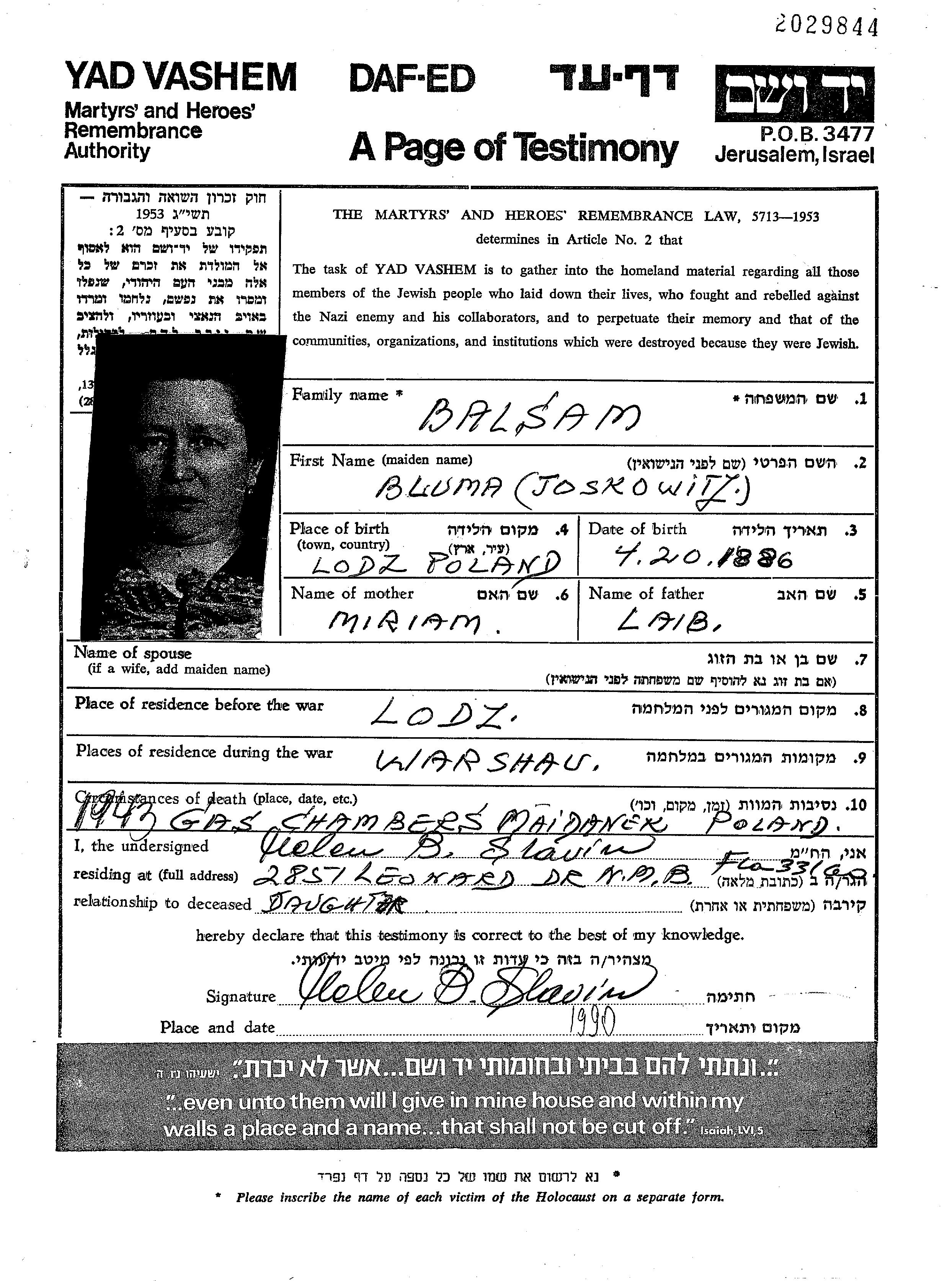 Bluma Balsam, geb. Joskowitz wurde im Jahr 1886 in Łódź, Polen geboren. Vor dem Zweiten Weltkrieg lebte sie in Łódź, Polen.