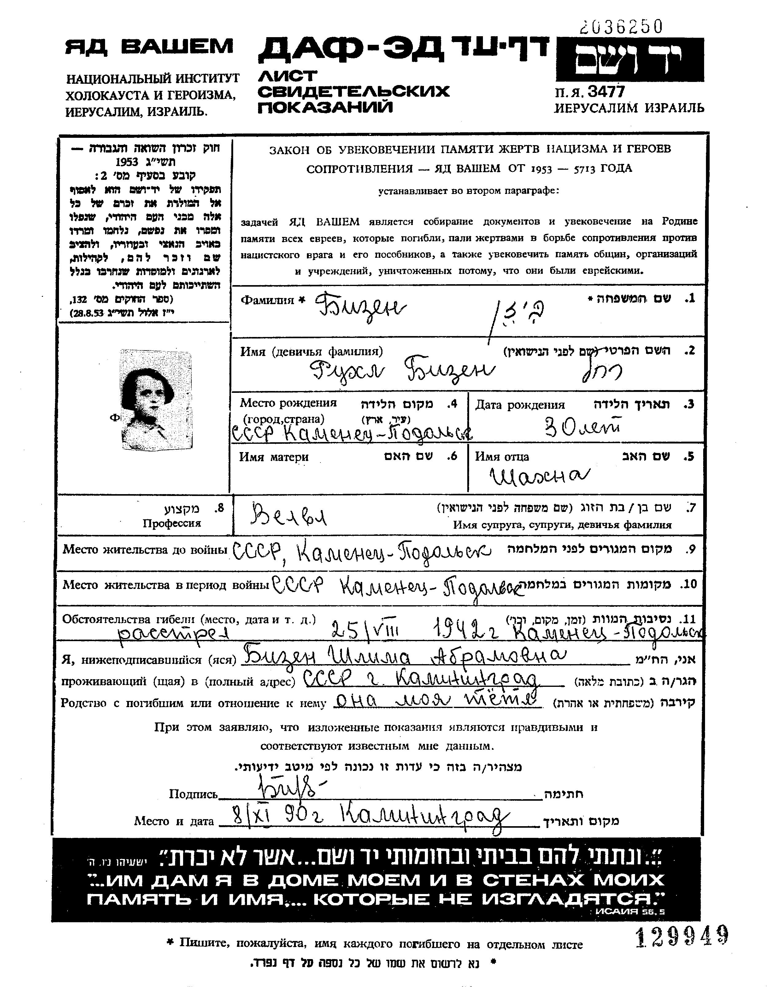 Rukhl Bizen wurde in Kamenets Podolsk, Ukraine (UdSSR) geboren. Vor dem Zweiten Weltkrieg lebte sie in Kamenets Podolsk, Ukraine (UdSSR).