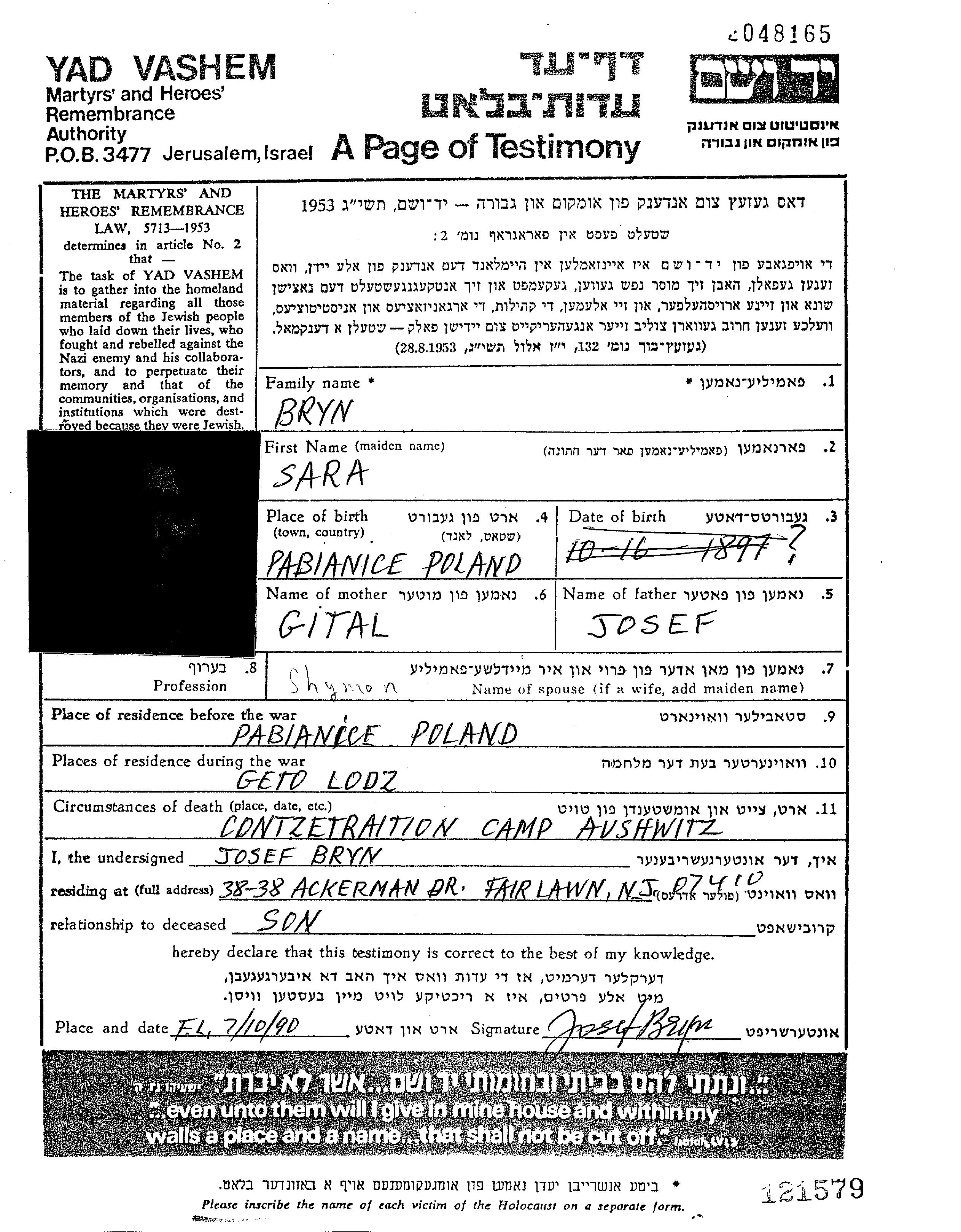 Sara Bryn wurde in Pabjanice, Polen geboren. Vor dem Zweiten Weltkrieg lebte sie in Pabjanice, Polen.