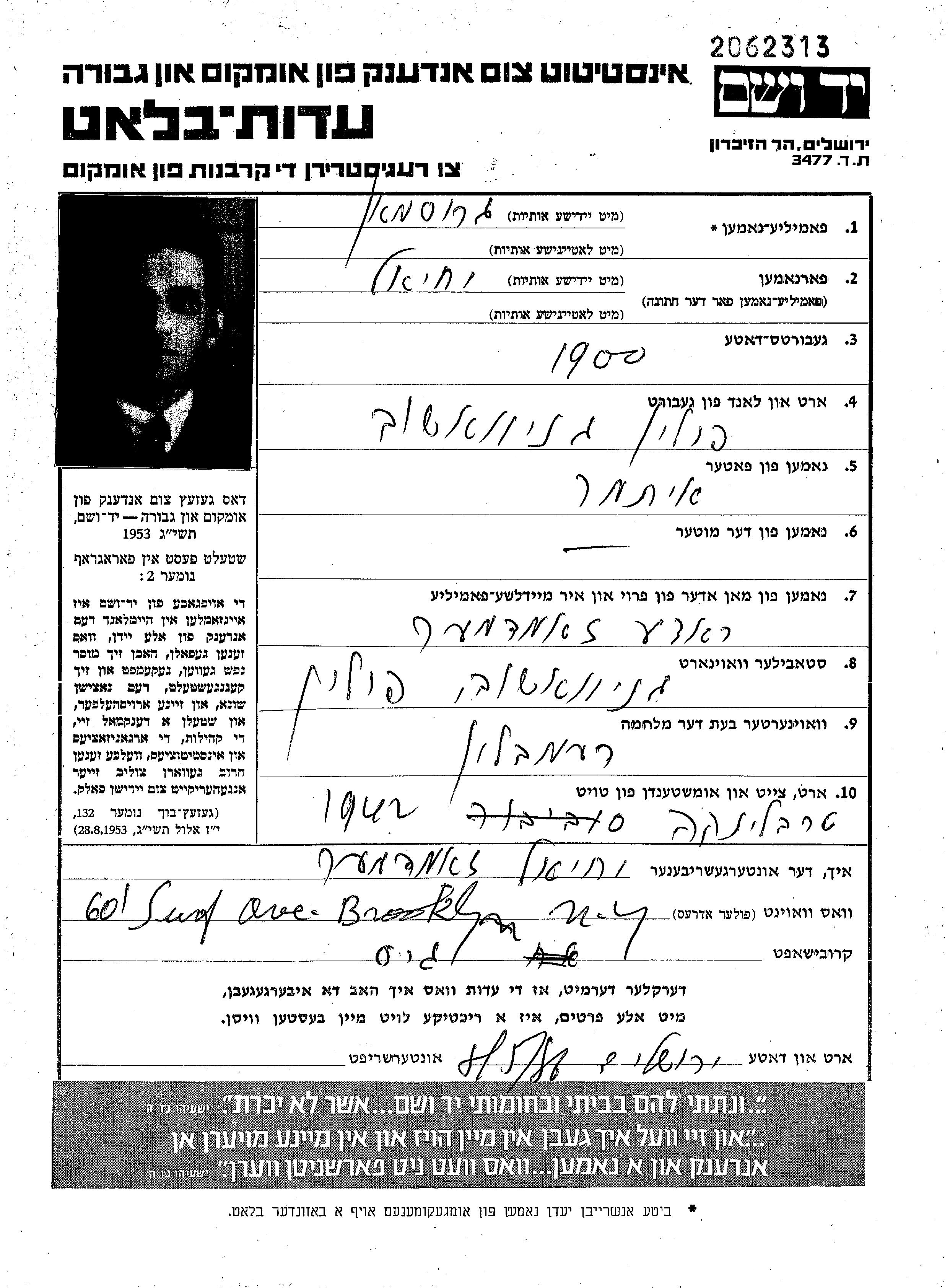 Yekhiel Grosman wurde im Jahr 1900 in Gniewoszow, Polen geboren. Vor dem Zweiten Weltkrieg lebte er in Gniewoszow, Polen.