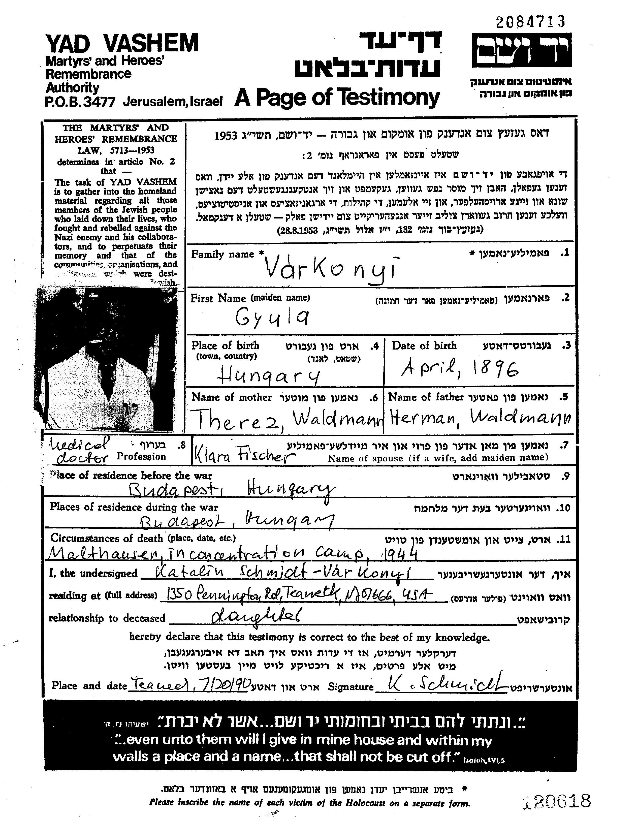Gyula Varkonyi wurde im Jahr 1896 in Ungarn geboren. Er war Arzt/ärztin. Vor dem Zweiten Weltkrieg lebte er in Budapest, Ungarn.
