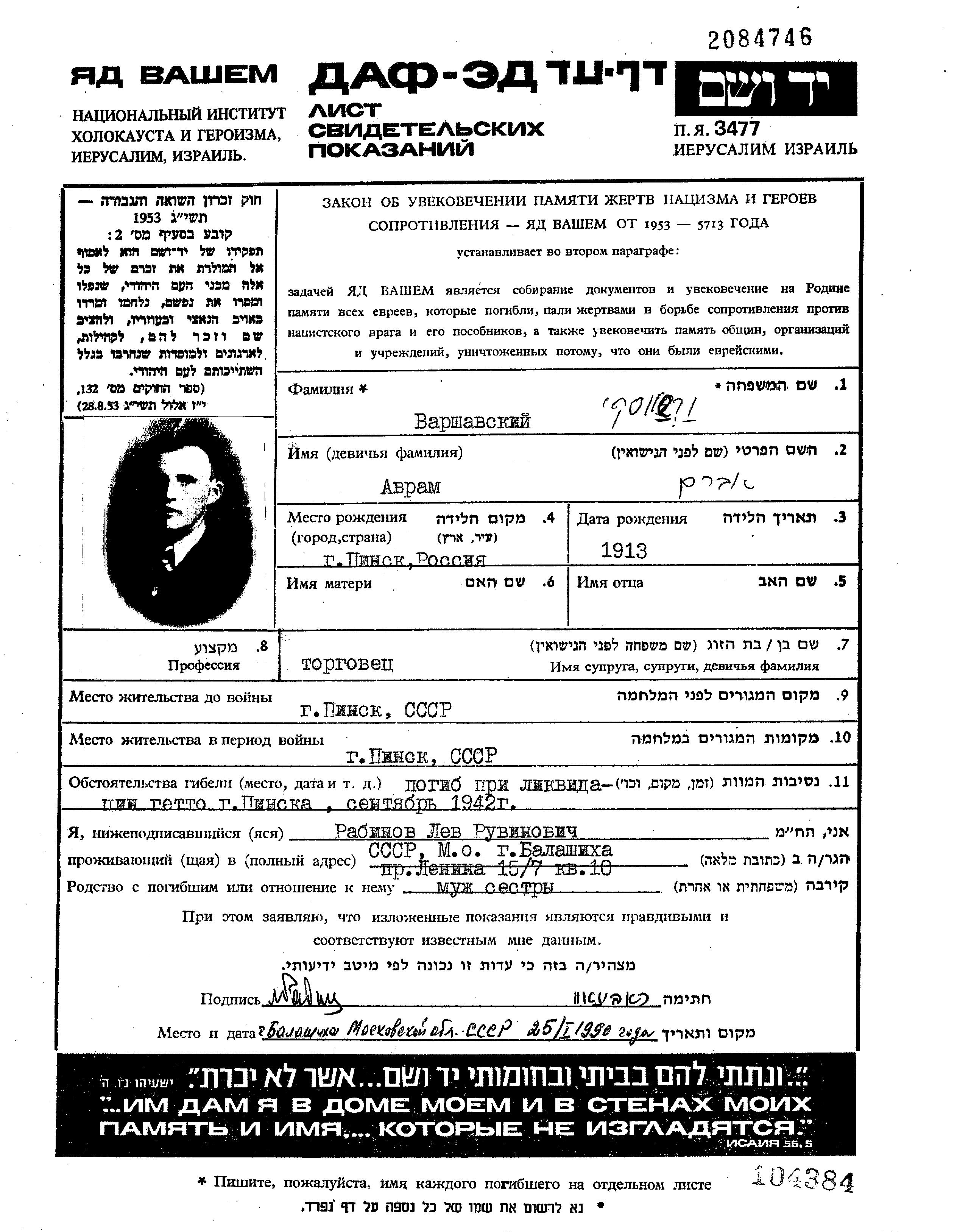 Varshavski Avram 1913 Pinsk, Polen Gedenkblatt