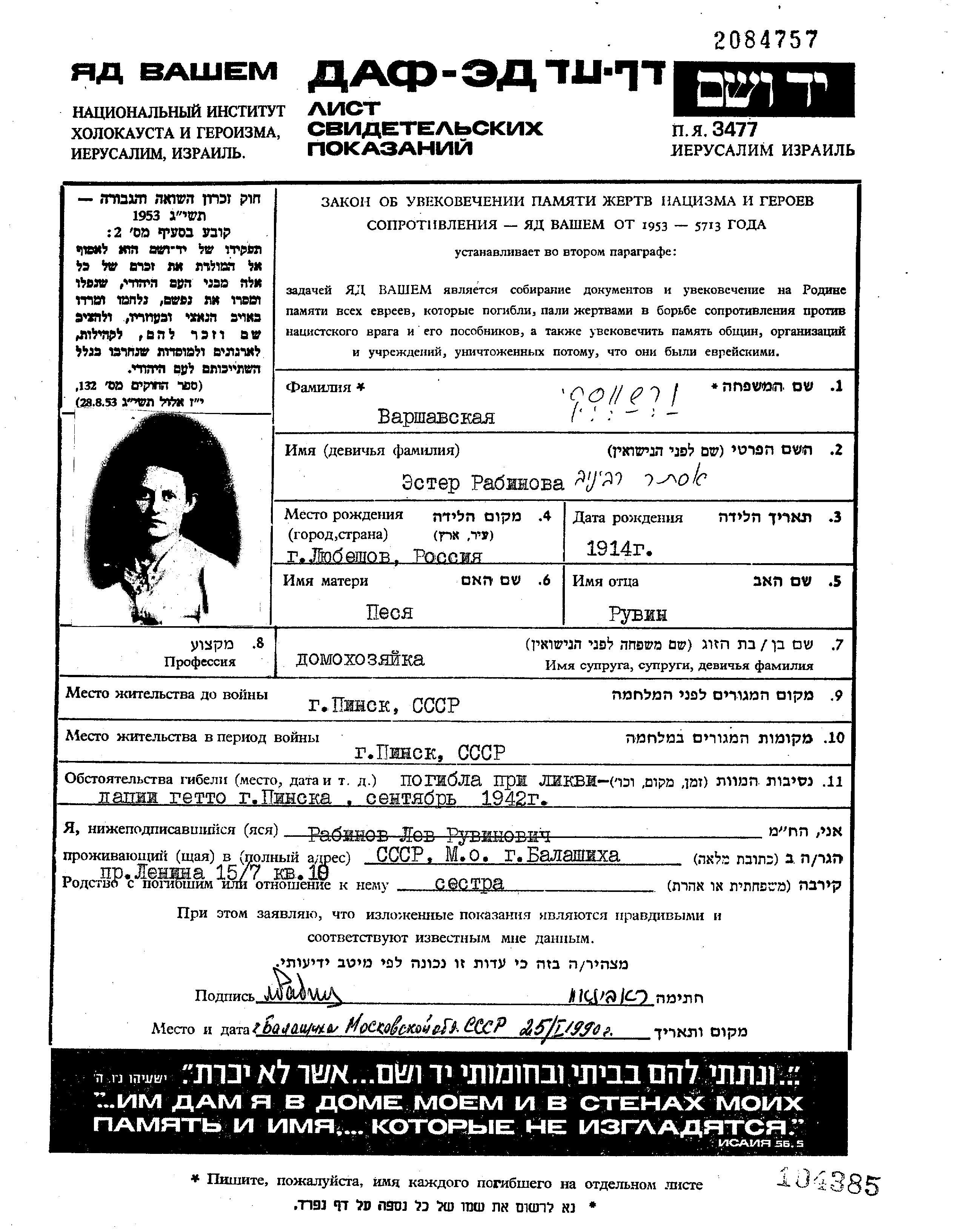 Ester Varshavski, geb. Rabinov wurde im Jahr 1914 in Lubieszów, Polen geboren. Sie war Hausfrau. Vor dem Zweiten Weltkrieg lebte sie in Pinsk, Polen.