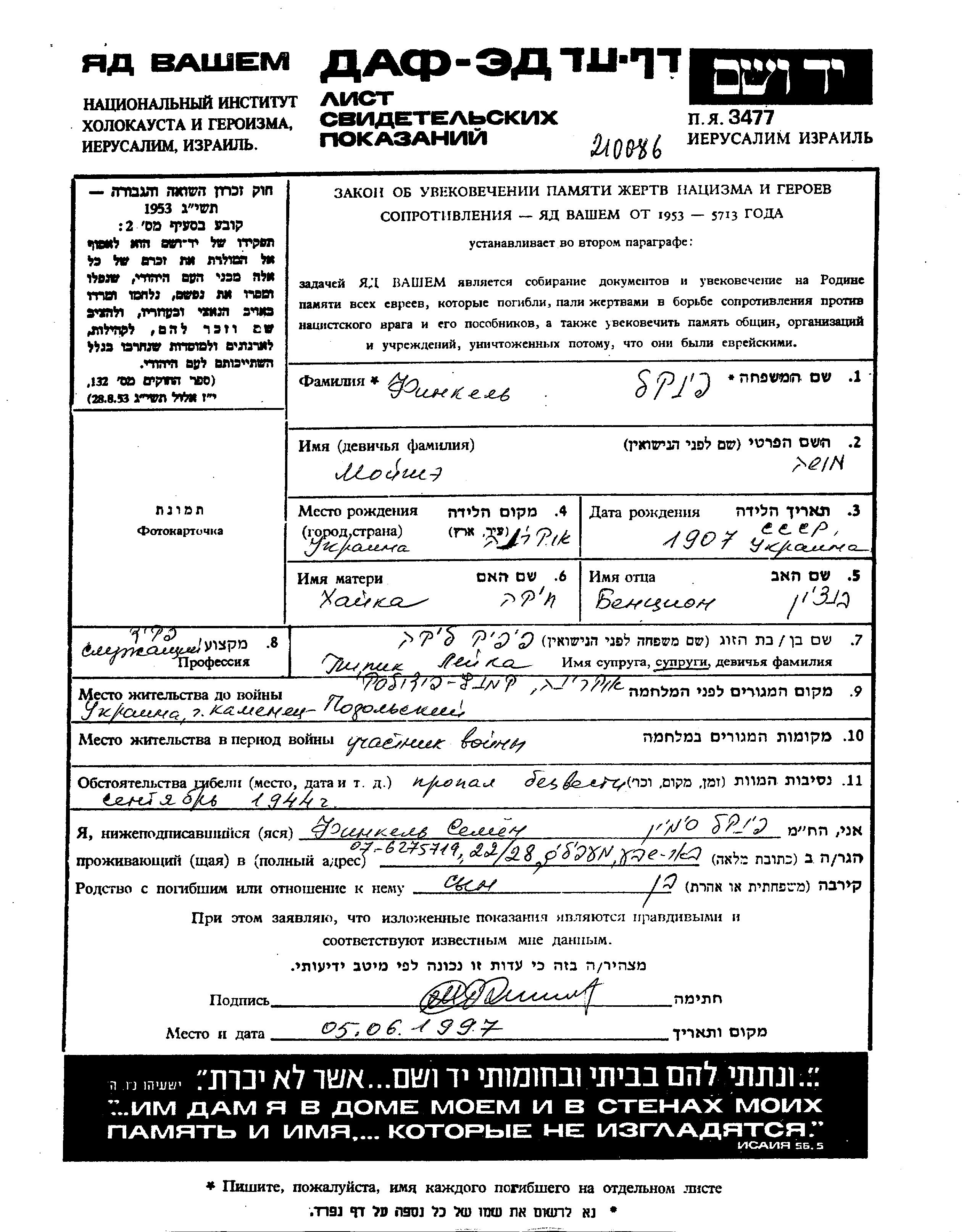 Finkel | Moishe | 1907 | Kamenets Podolskiy, Ukraine (UdSSR) | Gedenkblatt |