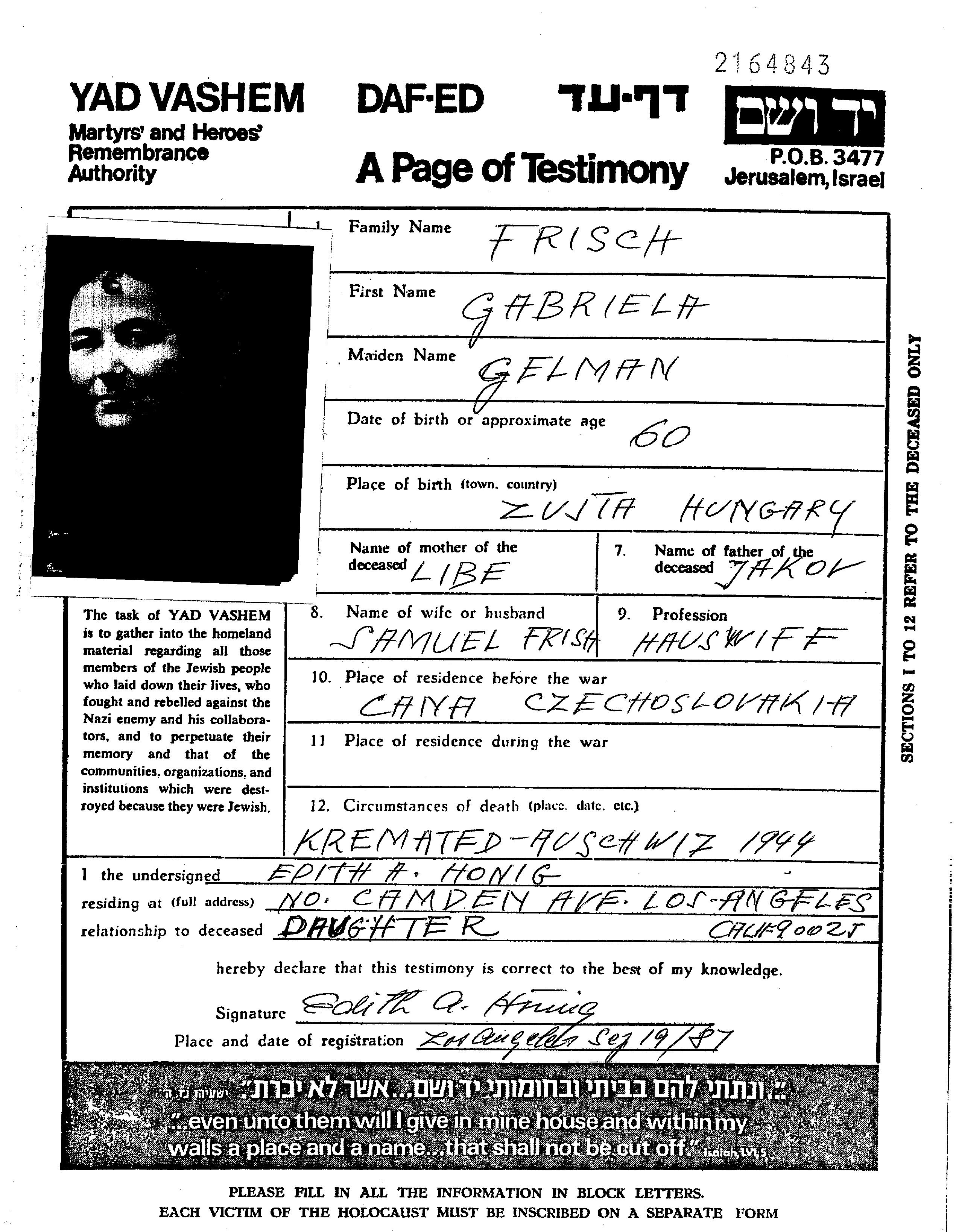 Gabriela Frisch, geb. Gelman wurde im Jahr 1884 in Zsujta, Ungarn geboren. Sie war Hausfrau. Vor dem Zweiten Weltkrieg lebte sie in Cana, Tschechoslowakei.