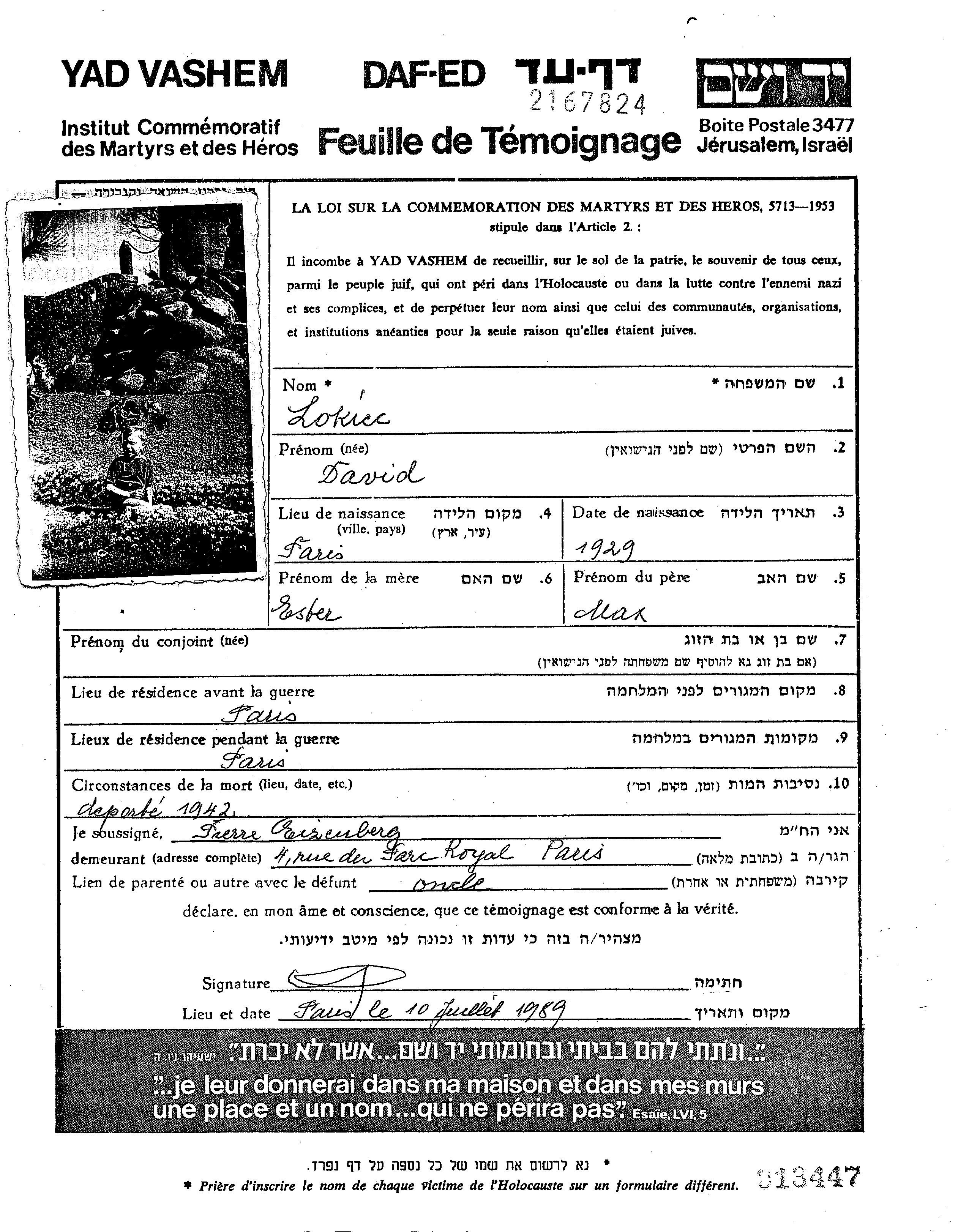 Lokiec Lukach David 1929 Paris, Frankreich Gedenkblatt