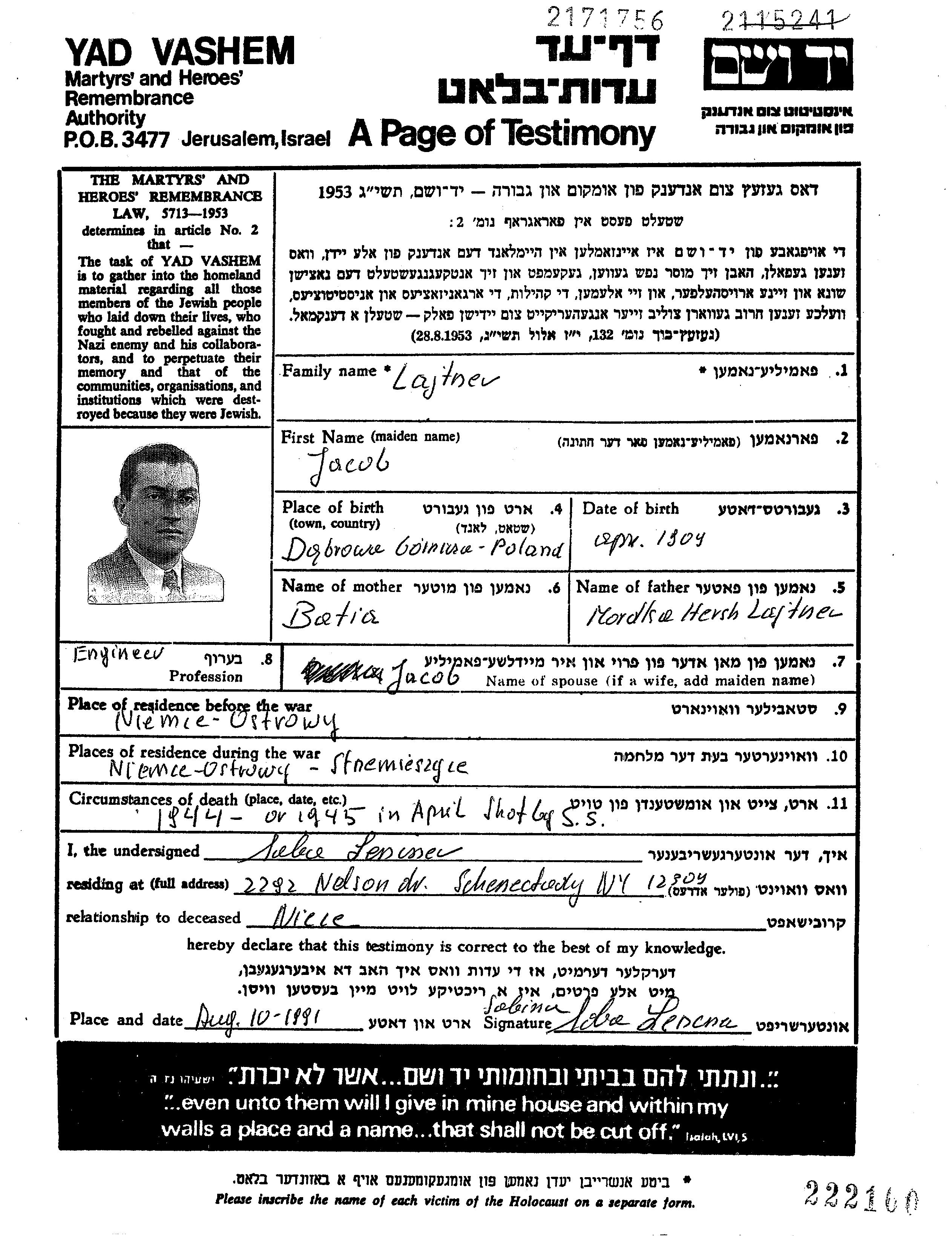Lajtner Jacob 1909 Niemce, Polen Gedenkblatt