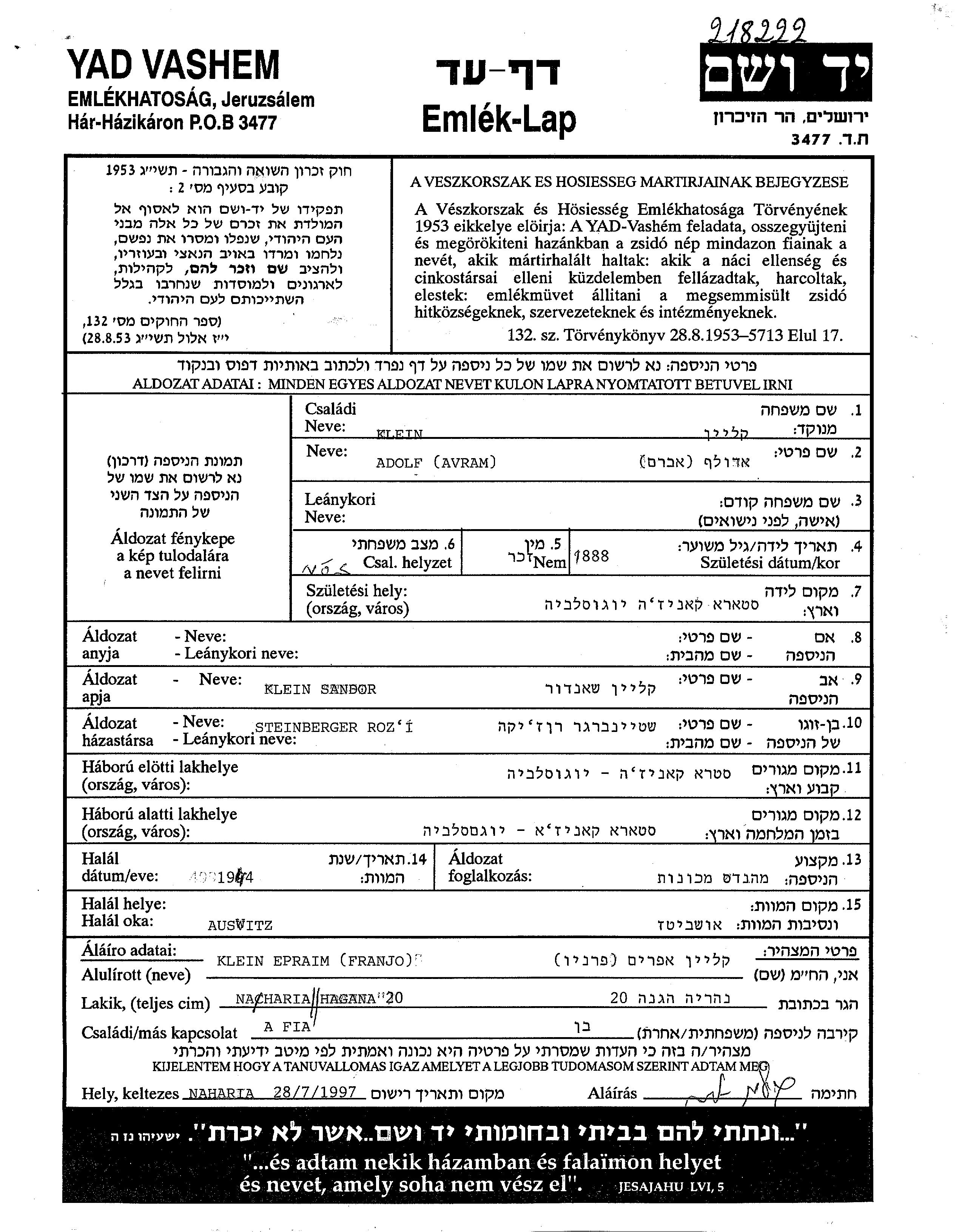 | Klein | Avram Adolf | 1888 | Stara Kanjiza, Jugoslawien | Gedenkblatt |
