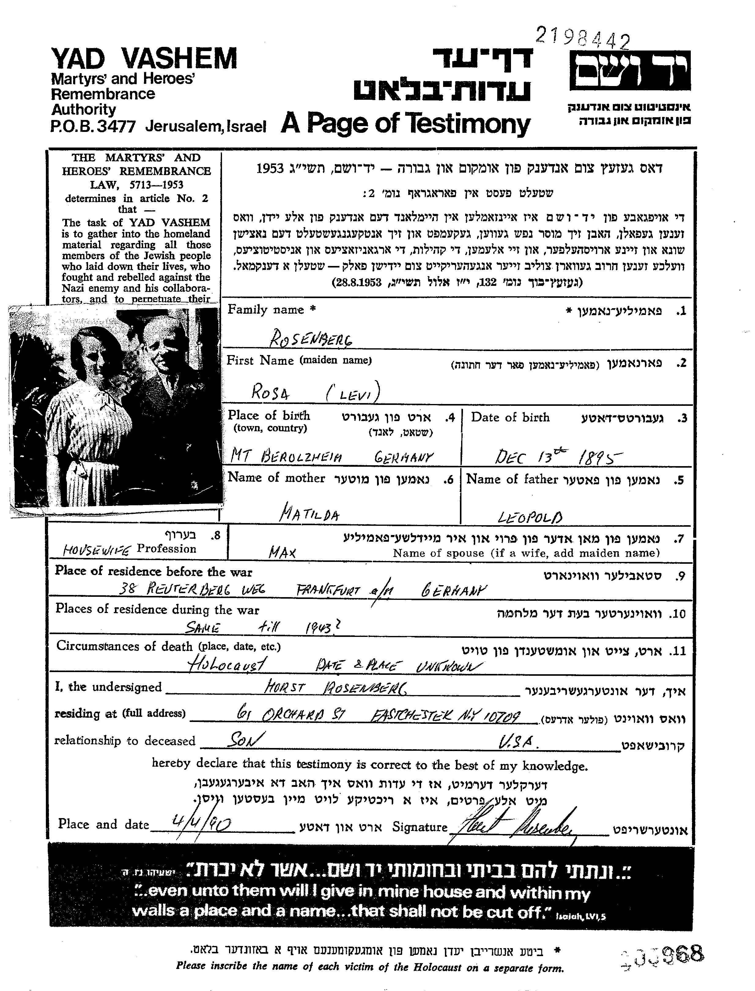 Rosa Rosenberg, geb. Levi wurde im Jahr 1895 in Markt Berolzheim, Deutsches Reich geboren. Sie war Hausfrau. Vor dem Zweiten Weltkrieg lebte sie in Frankfurt am Main, Deutsches Reich.