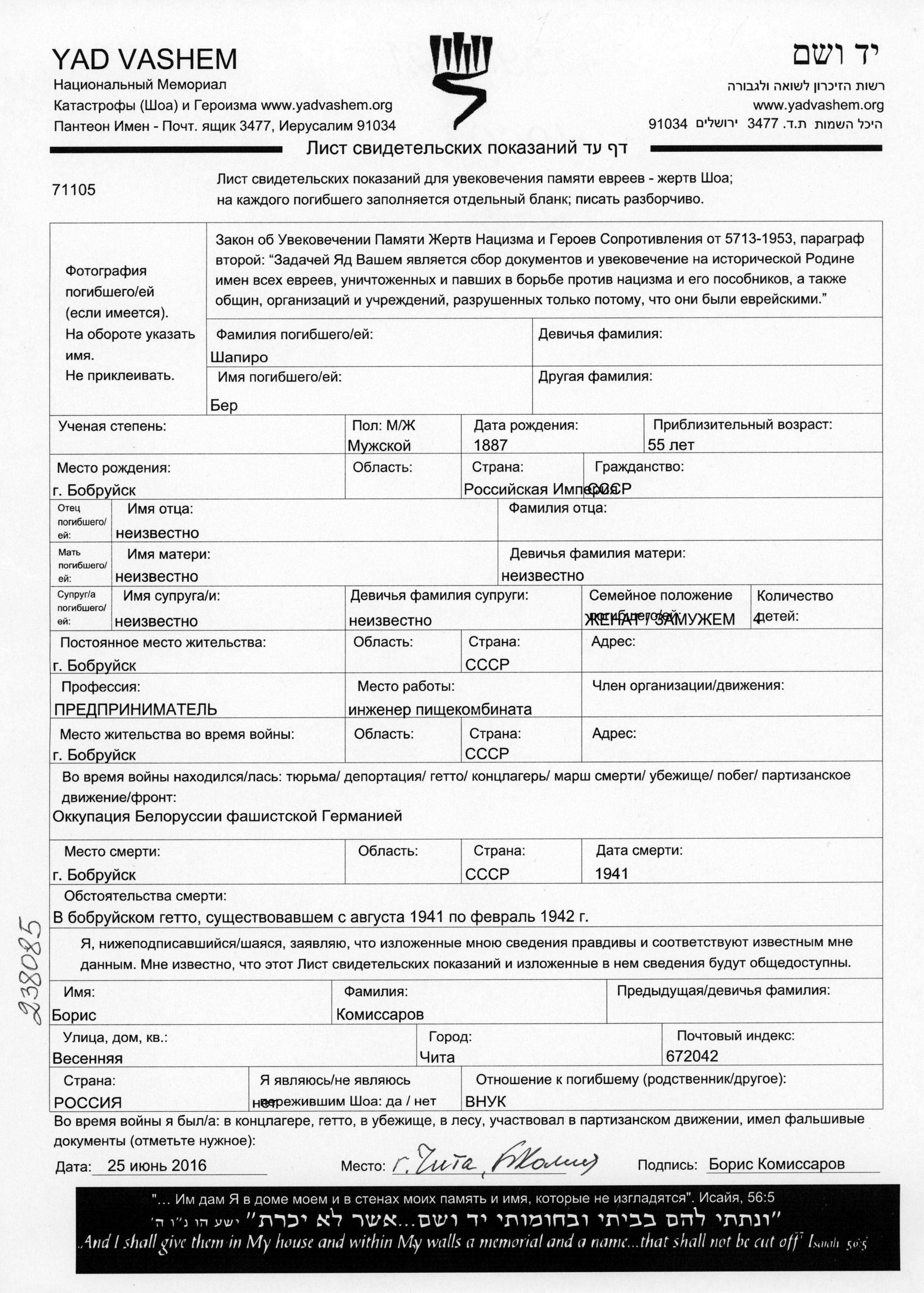 Ber Shapiro wurde im Jahr 1887 in Bobruysk, Weißrussland (UdSSR) geboren. Er war Ingenieur. Vor dem Zweiten Weltkrieg lebte er in Bobruysk, Weißrussland (UdSSR).