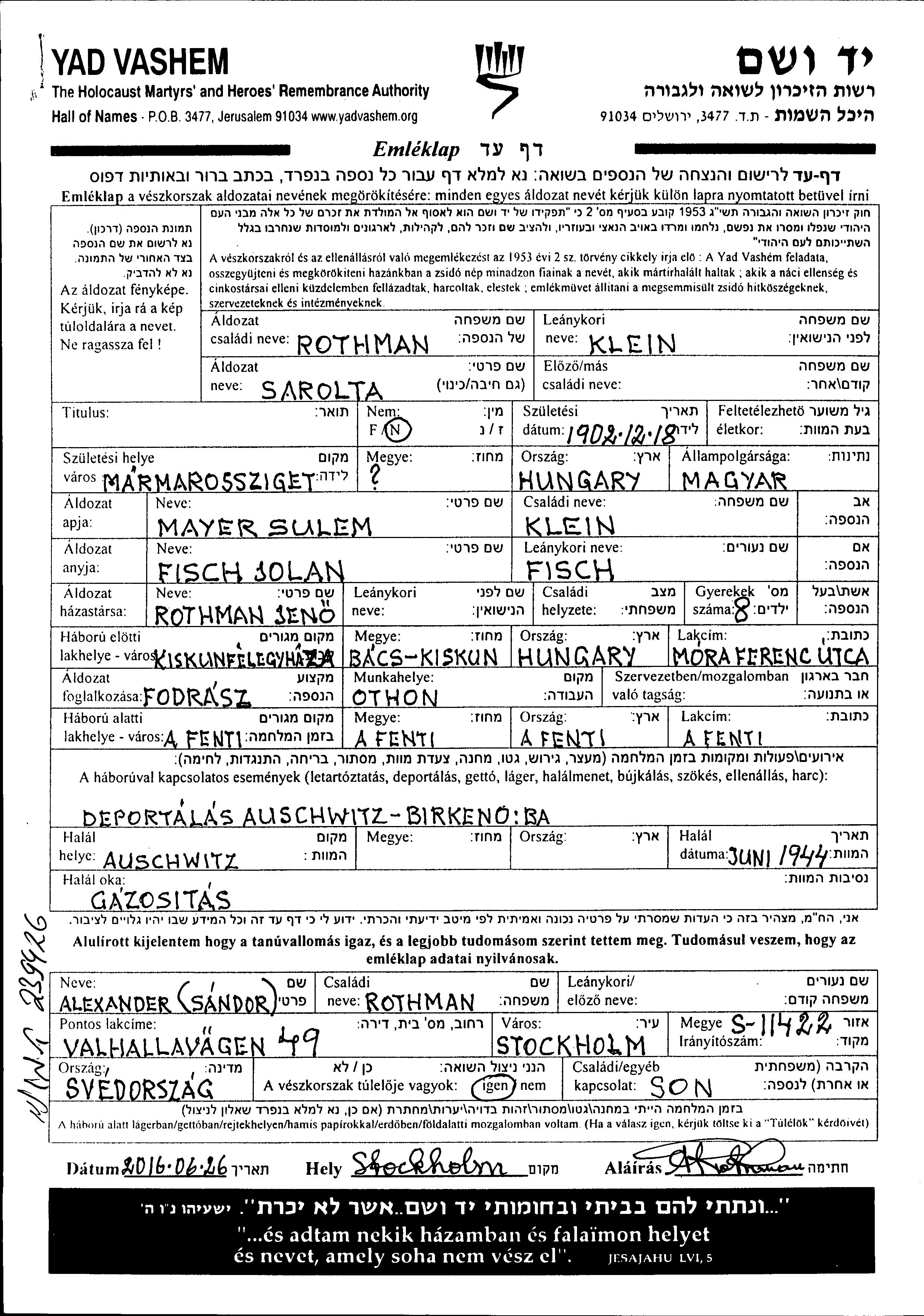Sarolta Rothman, geb. Klein wurde im Jahr 1902 in Sighet, Rumänien geboren. Sie war Friseur/-in. Vor dem Zweiten Weltkrieg lebte sie in Kiskunfelegyhaza, Ungarn.