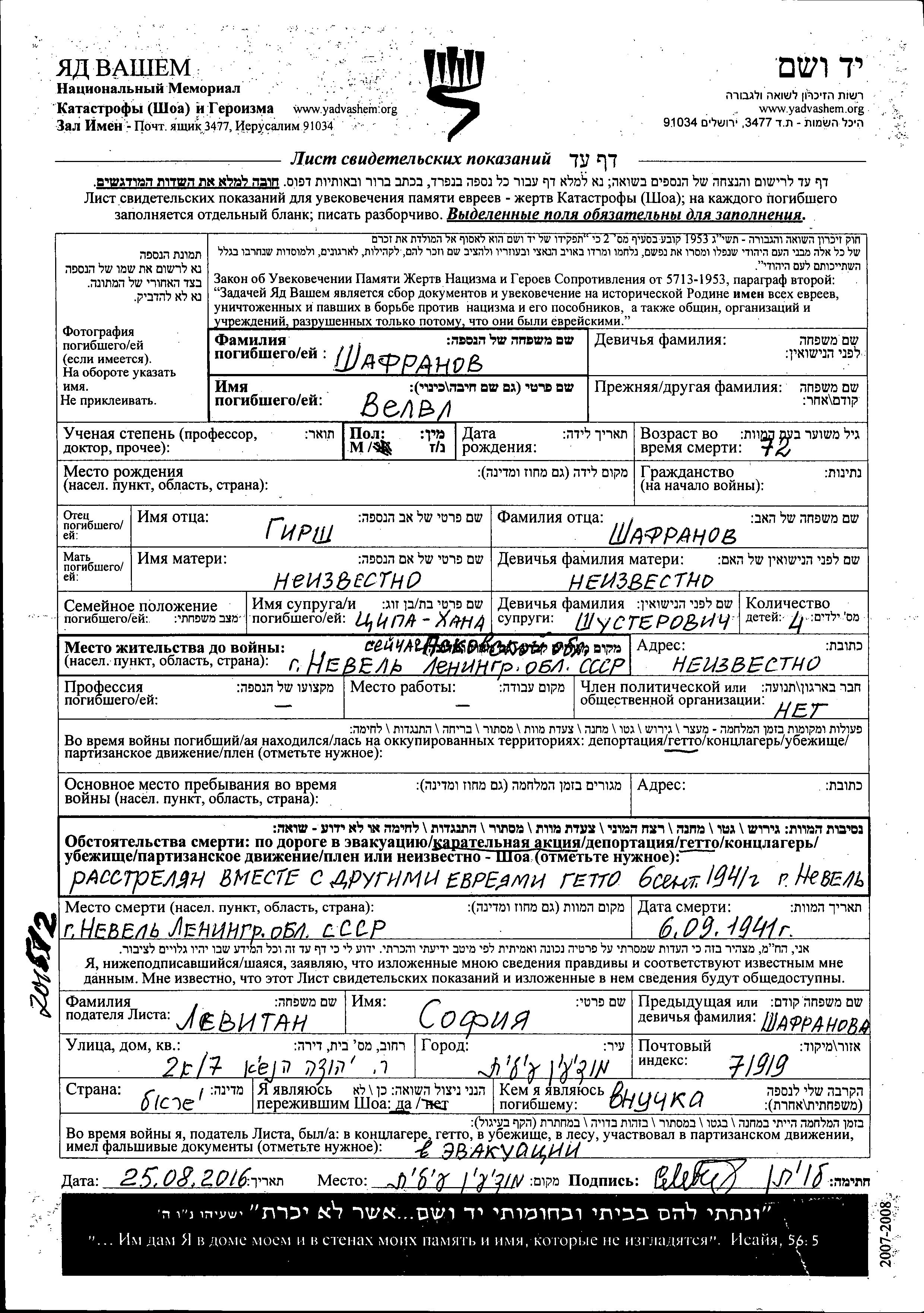 Velvl wurde in der Schoah ermordet. Todesort: Nevel, Russland (UdSSR) im Jahr 06/09/1941.