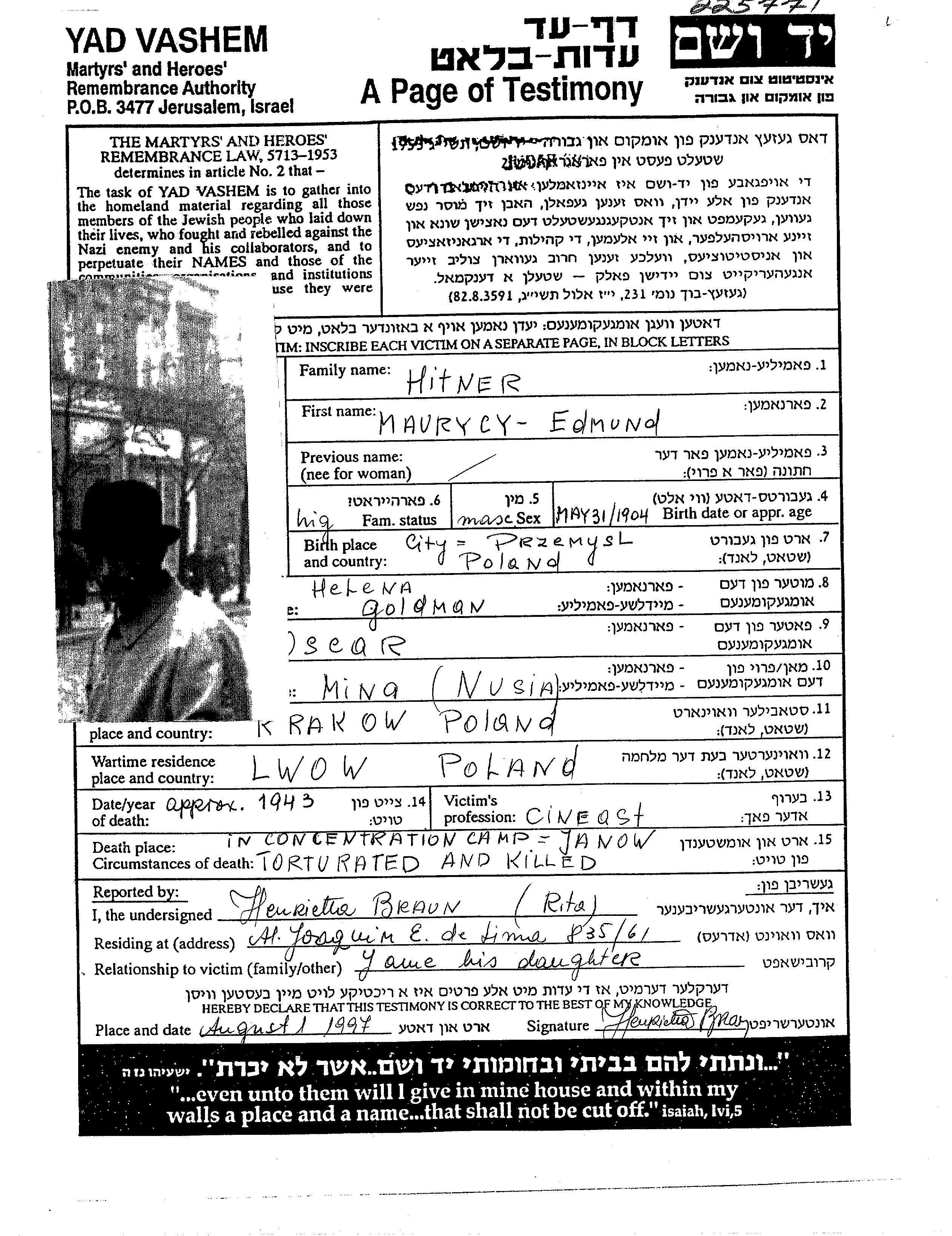Maurycy Edmund wurde in der Schoah ermordet. Todesort: Janow, Polen im Jahr 1943.