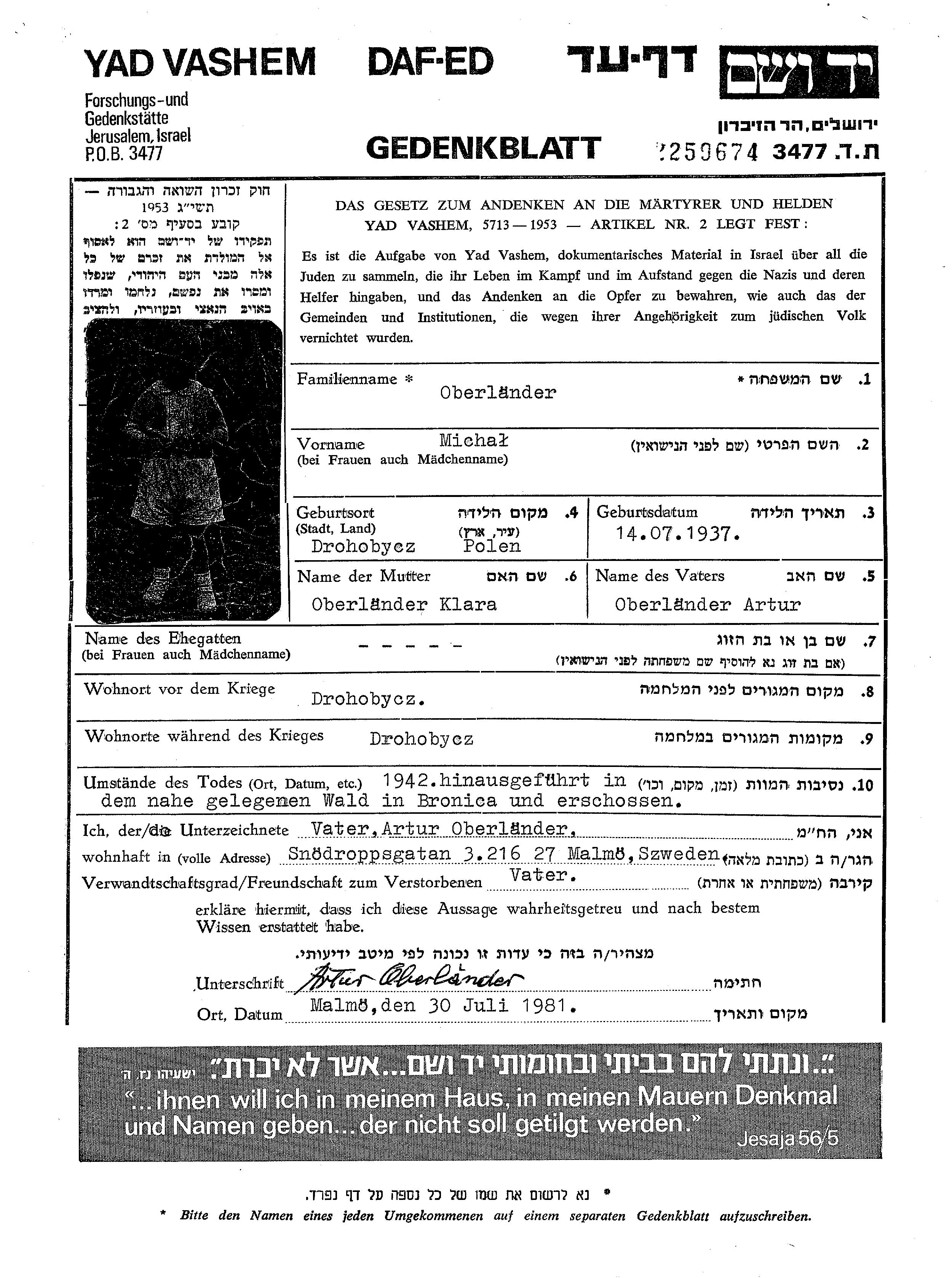 Michal Mikhael Oberländer wurde im Jahr 1937 in Drohobycz, Polen geboren. Vor dem Zweiten Weltkrieg lebte er in Drohobycz, Polen.