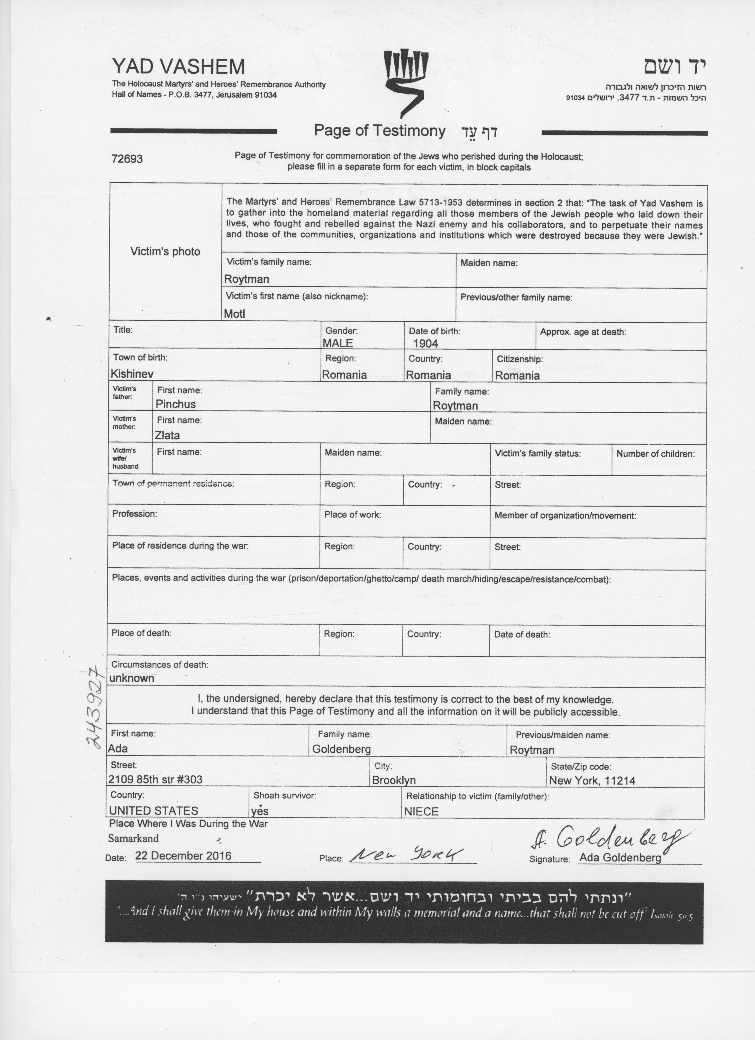 Roytman Motl 1904 unbekannter Ort, Gedenkblatt (digital, unterzeichnet)