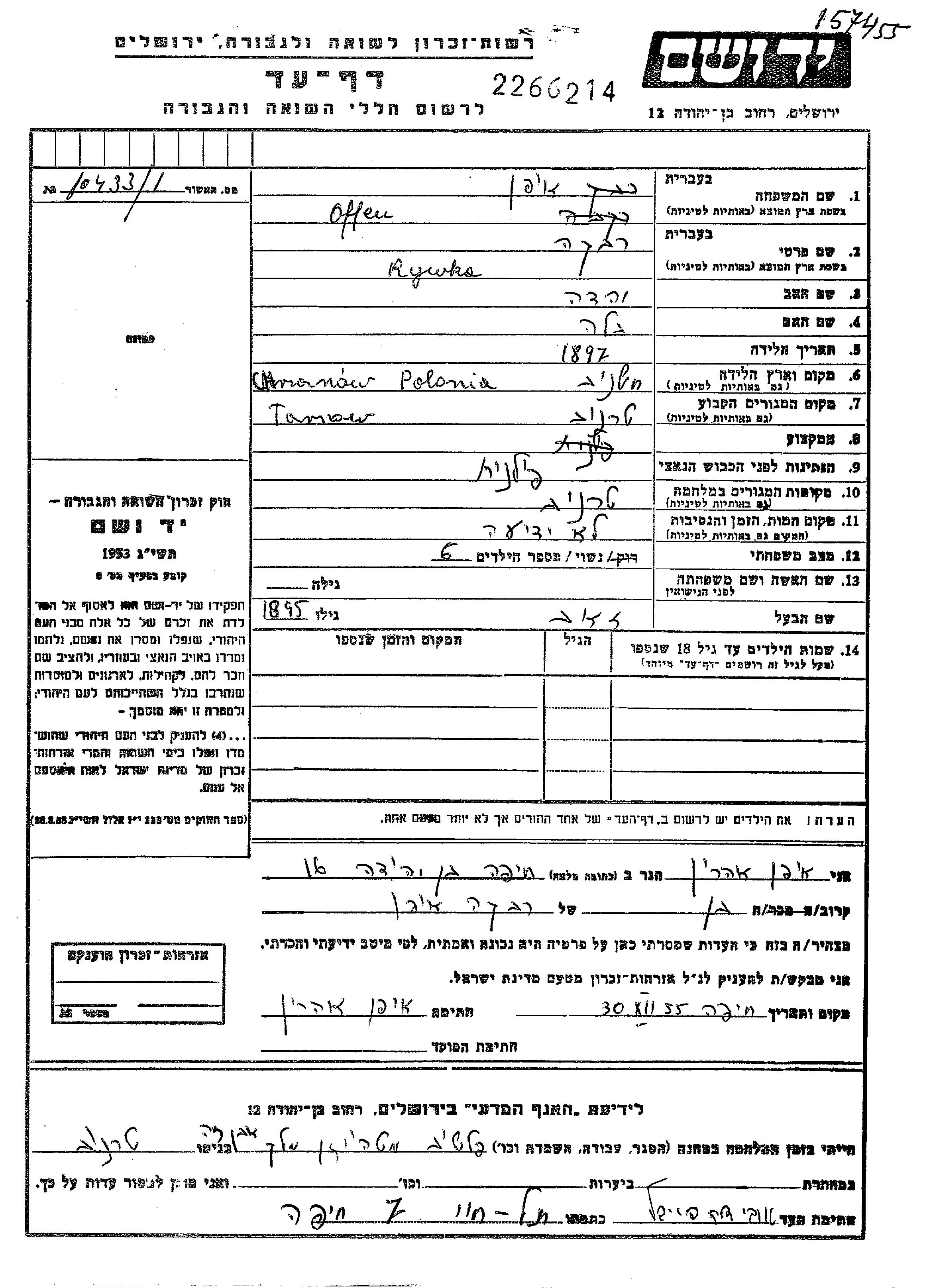Rywka Offen wurde im Jahr 1897 in Chrzanow, Polen geboren. Vor dem Zweiten Weltkrieg lebte sie in Tarnow, Polen.