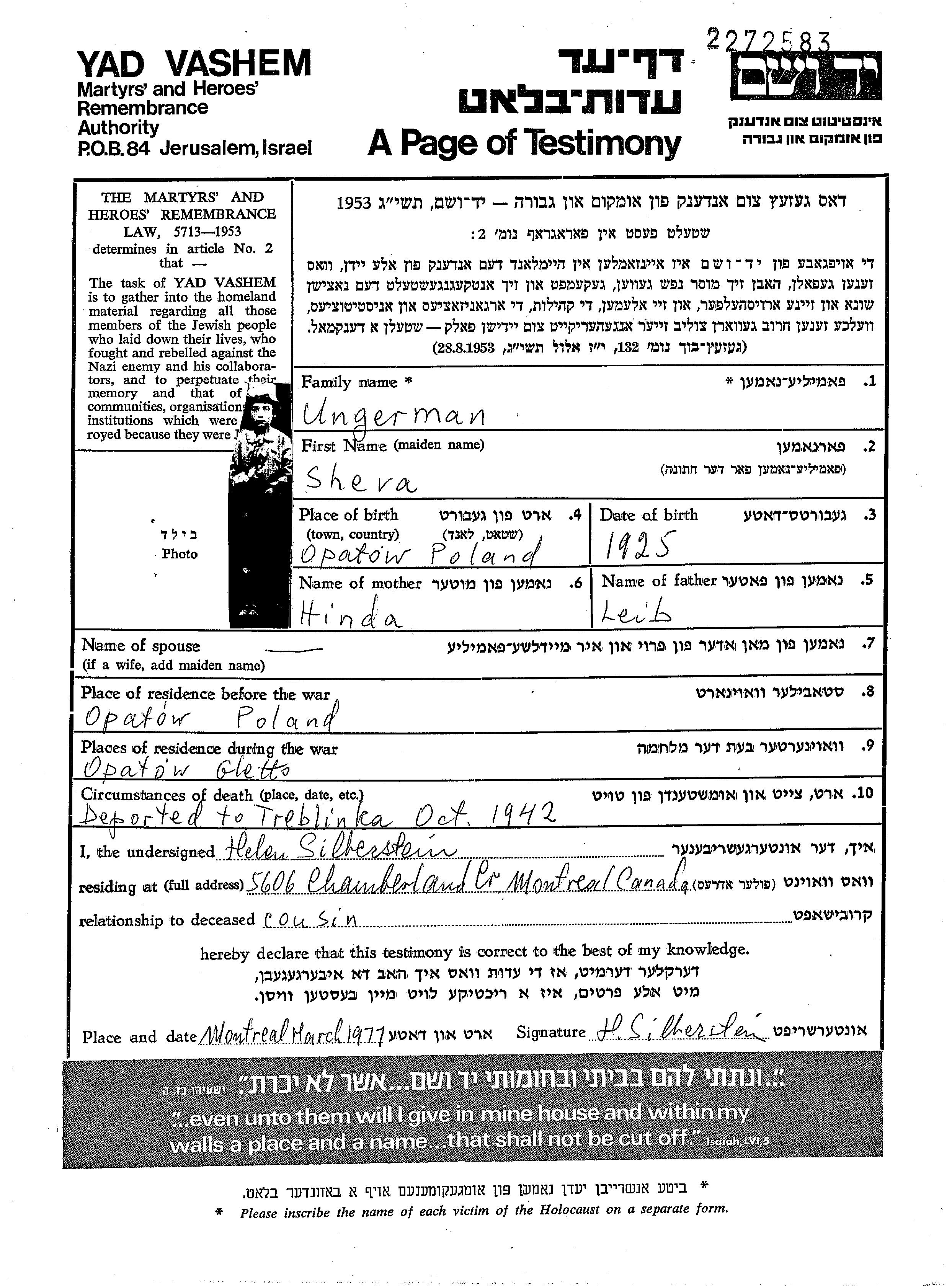 Sheva Ungerman wurde im Jahr 1925 in Opatow, Polen geboren. Vor dem Zweiten Weltkrieg lebte sie in Opatow, Polen.