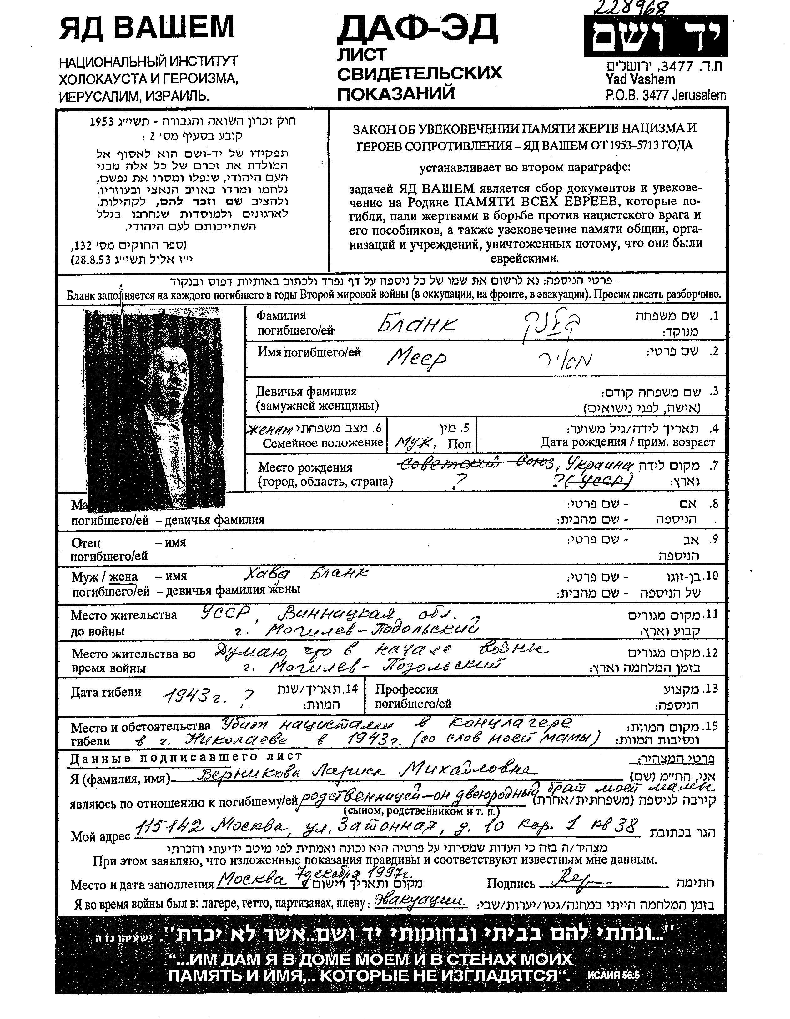 Meyer Blank wurde in Ukraine (UdSSR) geboren. Vor dem Zweiten Weltkrieg lebte er in Mogilev Podolskiy, Ukraine (UdSSR).