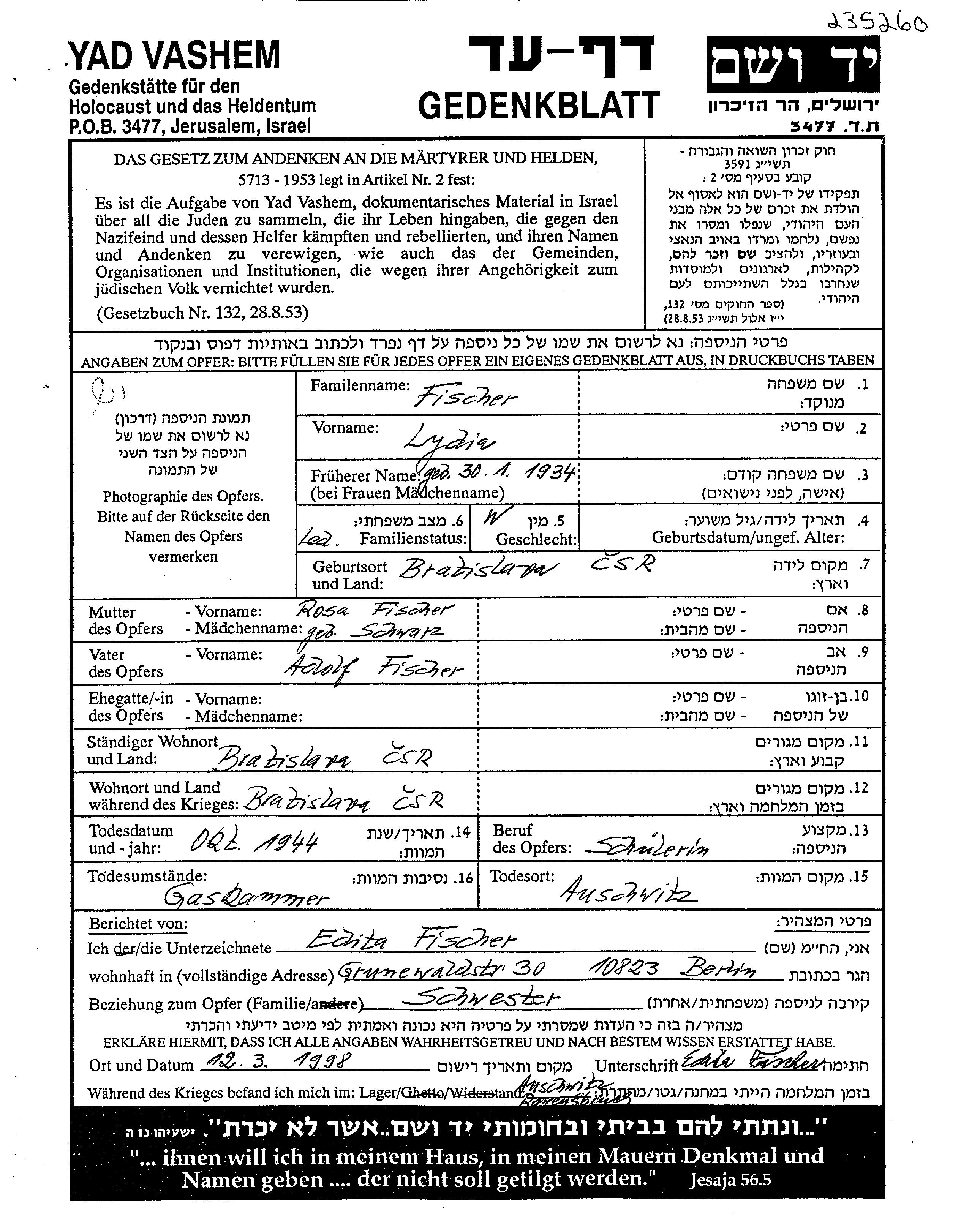 Lydia wurde in der Schoah ermordet. Todesort: Auschwitz, Polen im Jahr 1944.