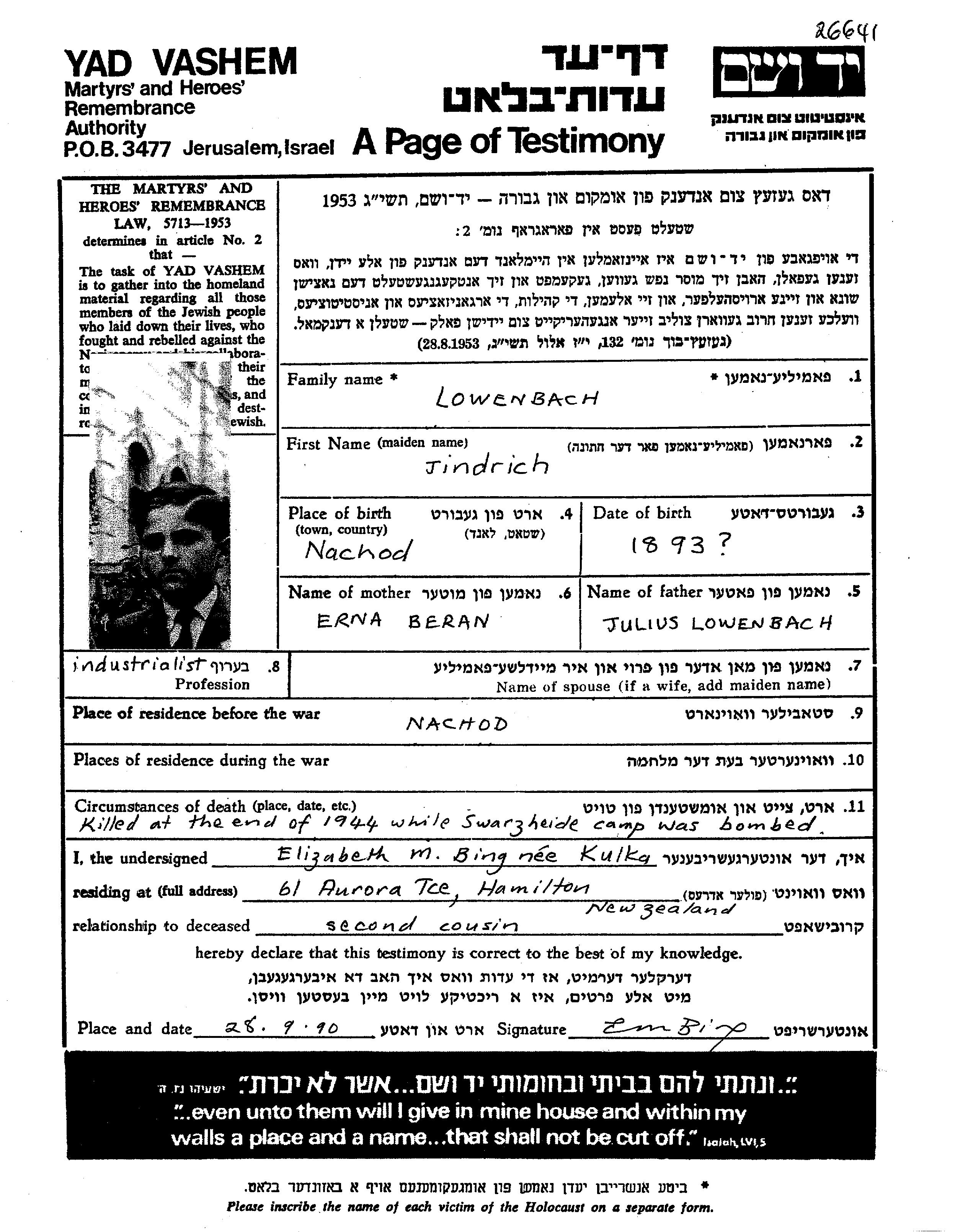 Löwenbach | Jindřich | 1893 | Nachod, Tschechoslowakei | Gedenkblatt |