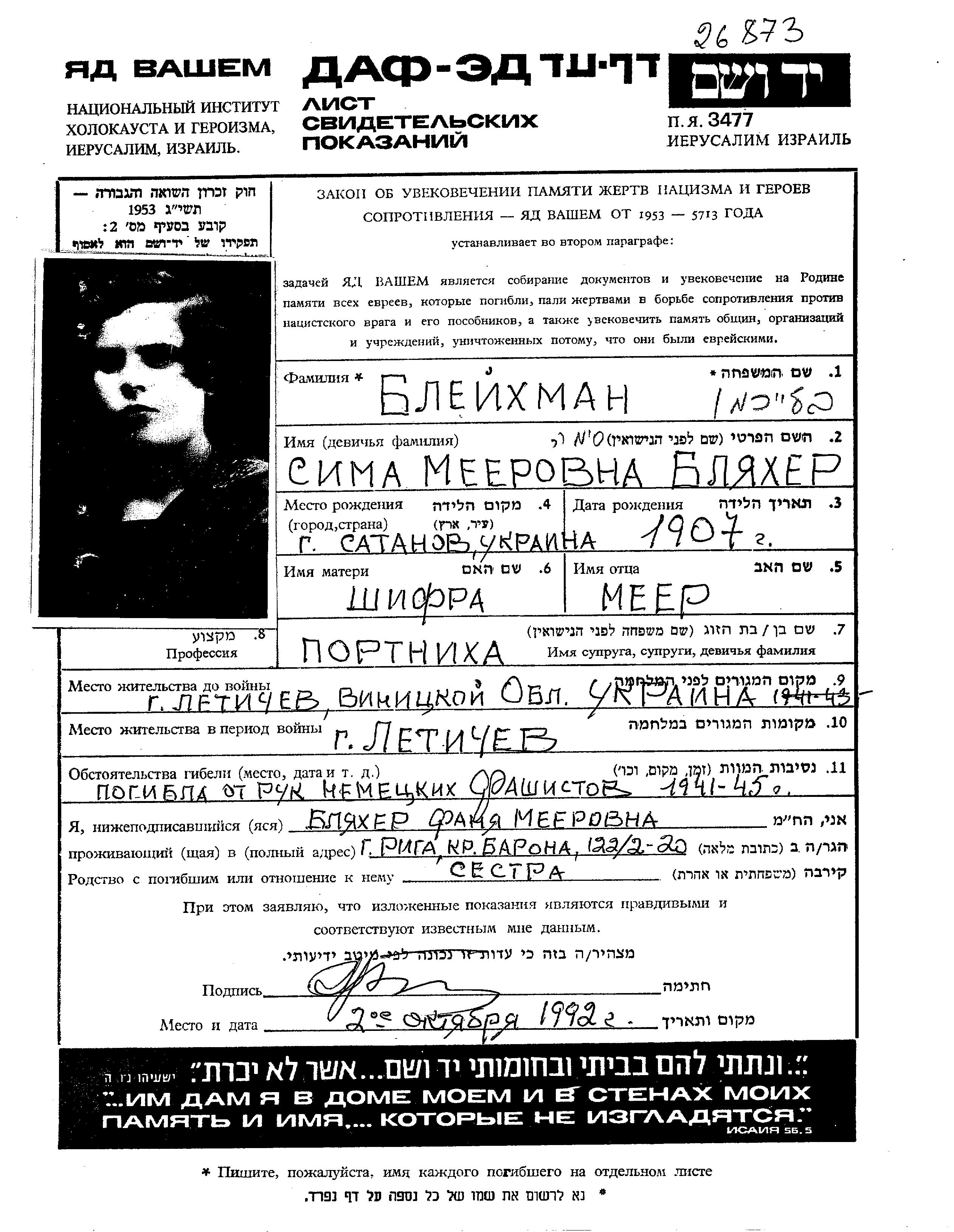 Sima Bleikhman Blekhman, geb. Blyakher wurde im Jahr 1907 in Satanov, Ukraine (UdSSR) geboren. Sie war Schneider. Vor dem Zweiten Weltkrieg lebte sie in Letichev, Ukraine (UdSSR).