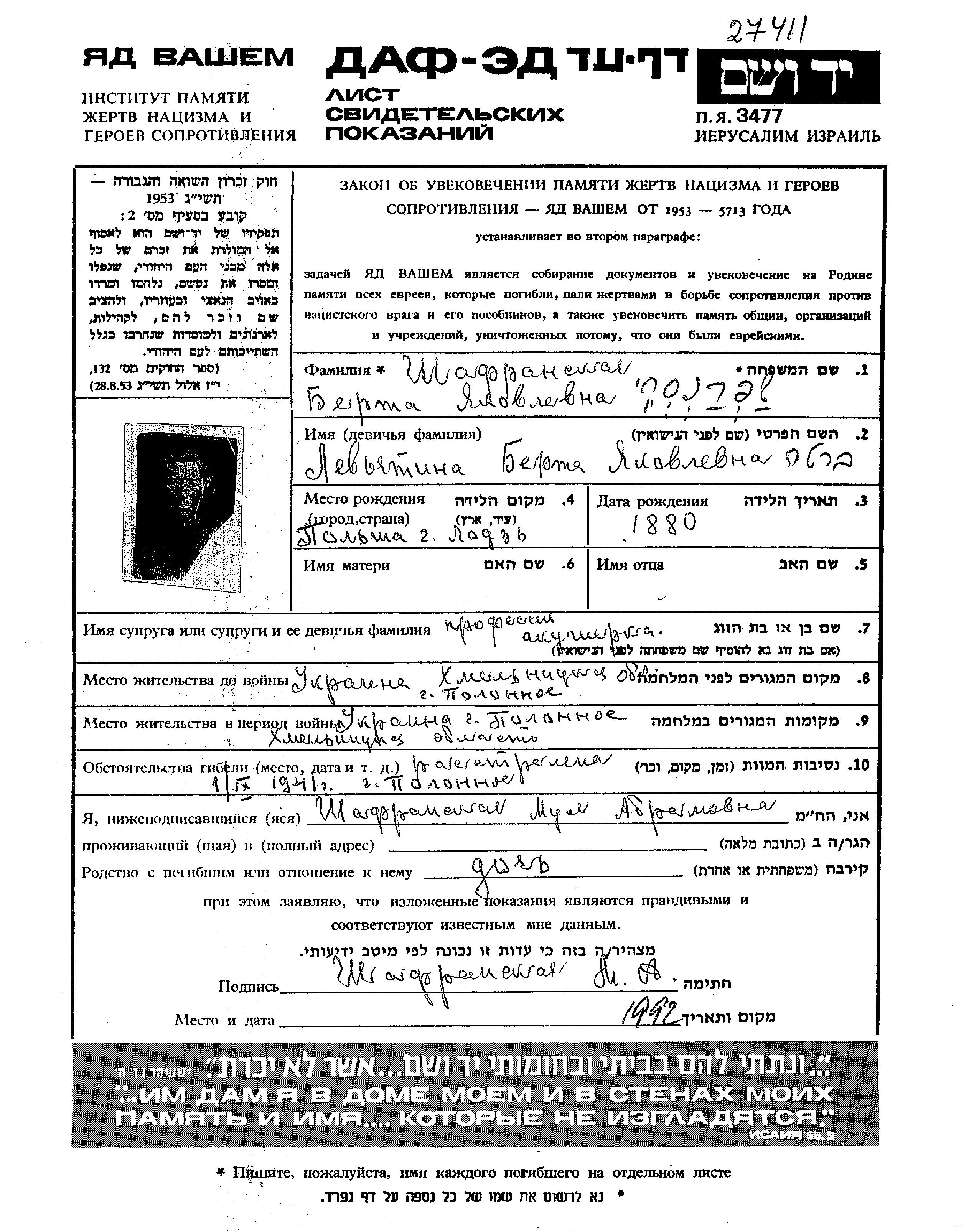 Berta wurde in der Schoah ermordet. Todesort: Polonnoye, Ukraine (UdSSR) im Jahr 01/09/1941.