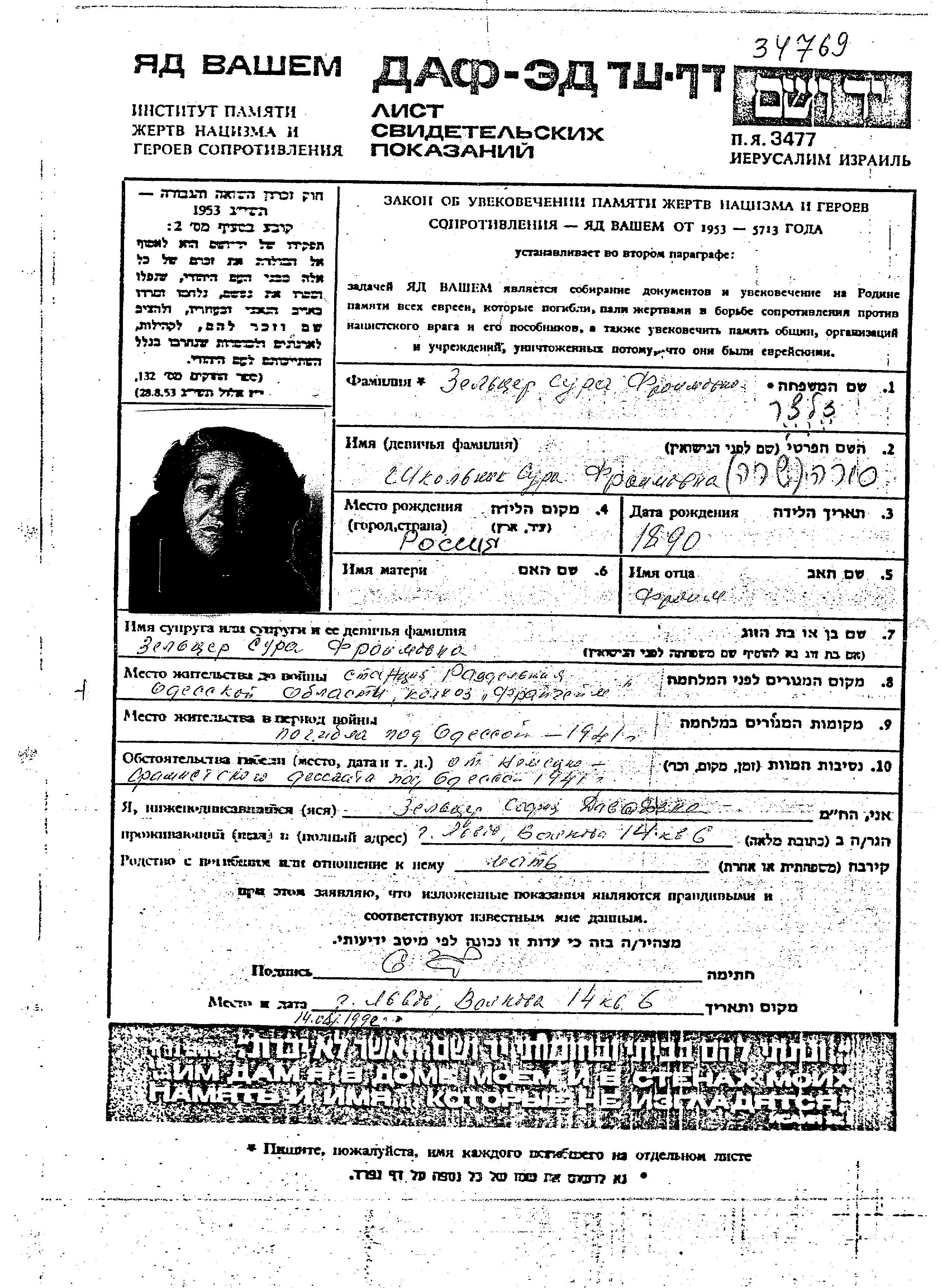 Sura Zeltzer, geb. Shkolnik wurde im Jahr 1890 in Ukraine (UdSSR) geboren. Vor dem Zweiten Weltkrieg lebte sie in Razdelnaya, Ukraine (UdSSR).