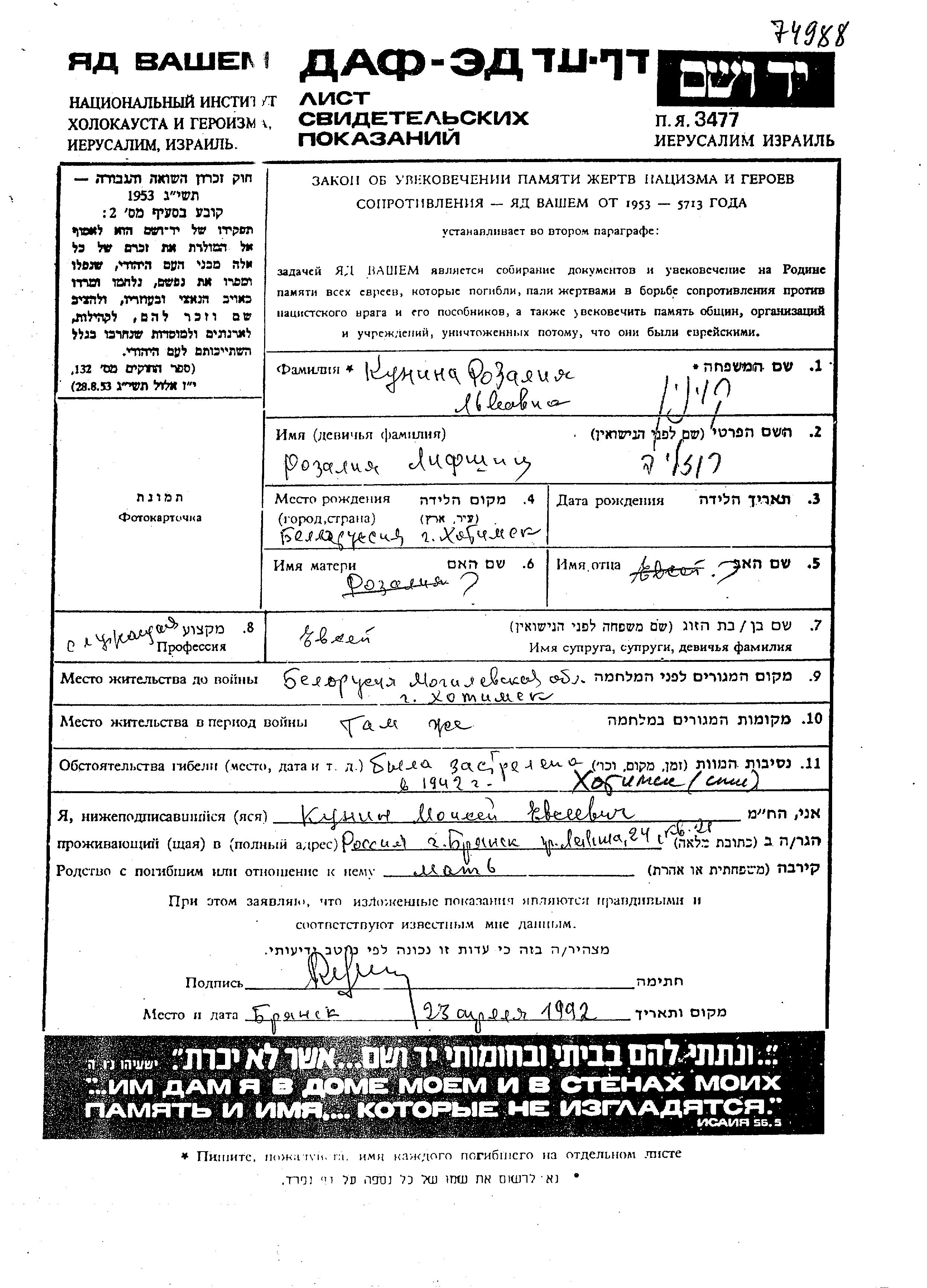 Rozalia Kunin Konin, geb. Lifshitz wurde in Khotimsk, Weißrussland (UdSSR) geboren. Sie war Angestellte/-r. Vor dem Zweiten Weltkrieg lebte sie in Khotimsk, Weißrussland (UdSSR).